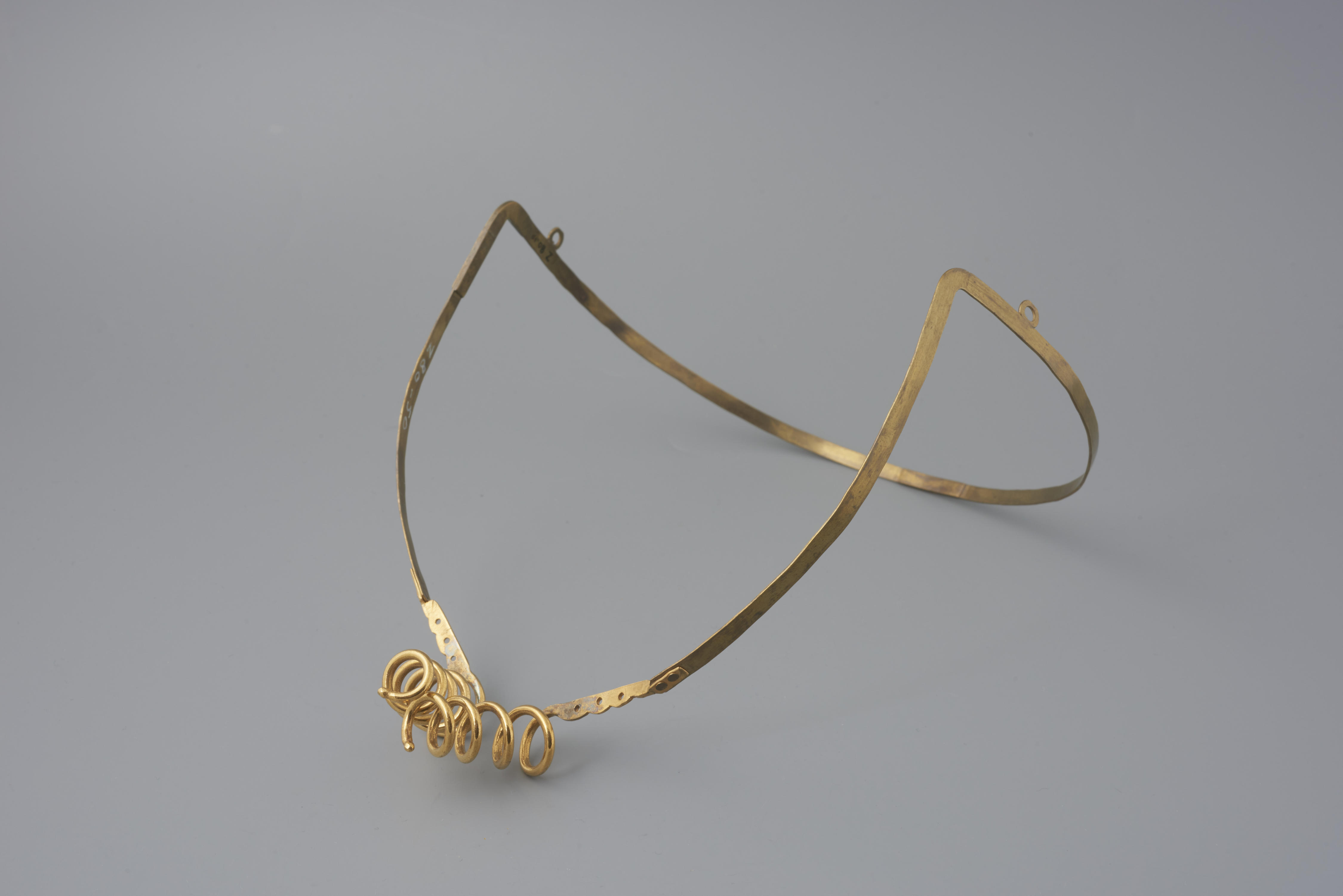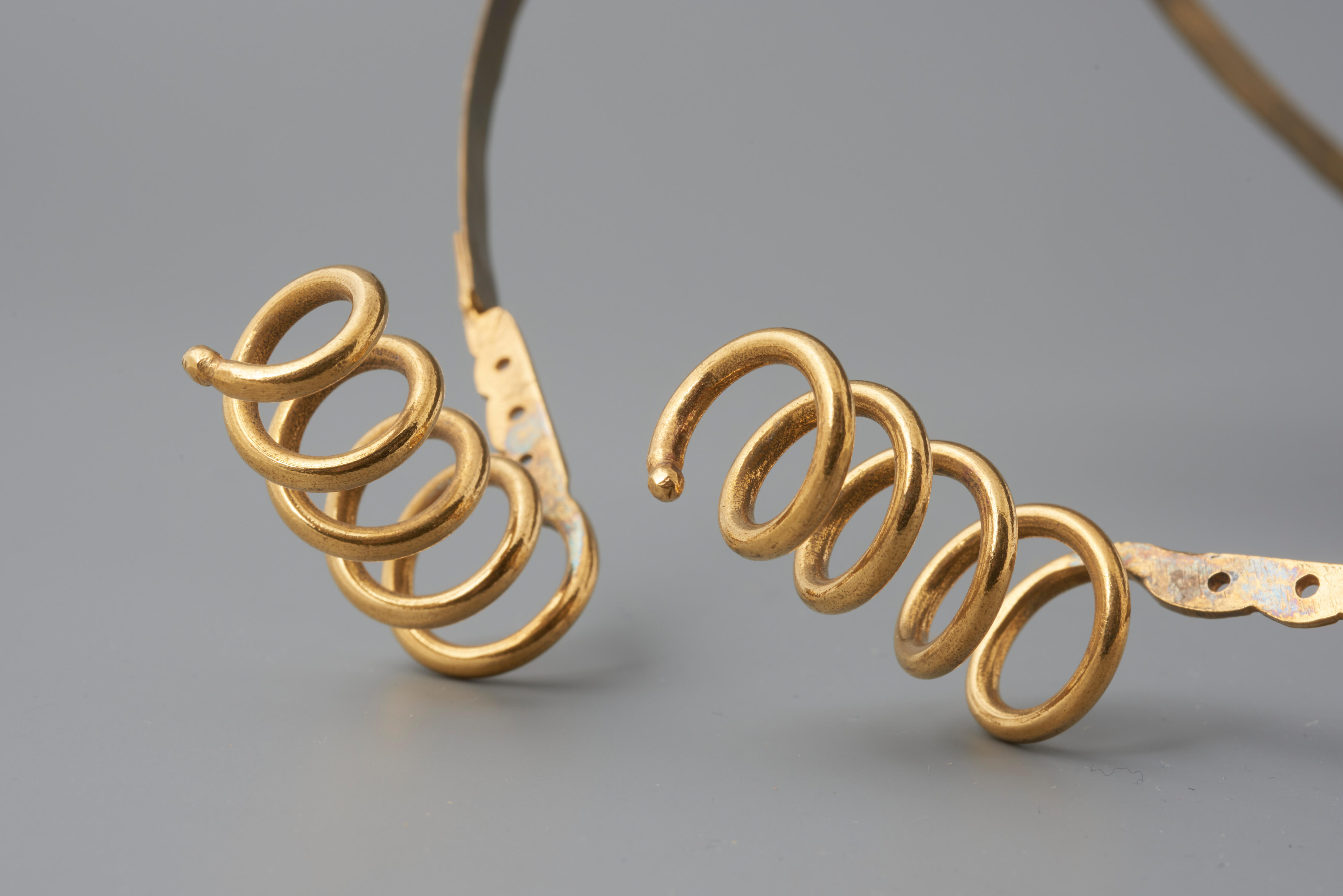 Messing oorijzer met messing krullen van vijf windingen. De krullen zijn in 1955 in het museum verguld. De vervaardiger en vervaardigingsdatum zijn onbekend. Het oorijzer is gedragen op Walcheren.