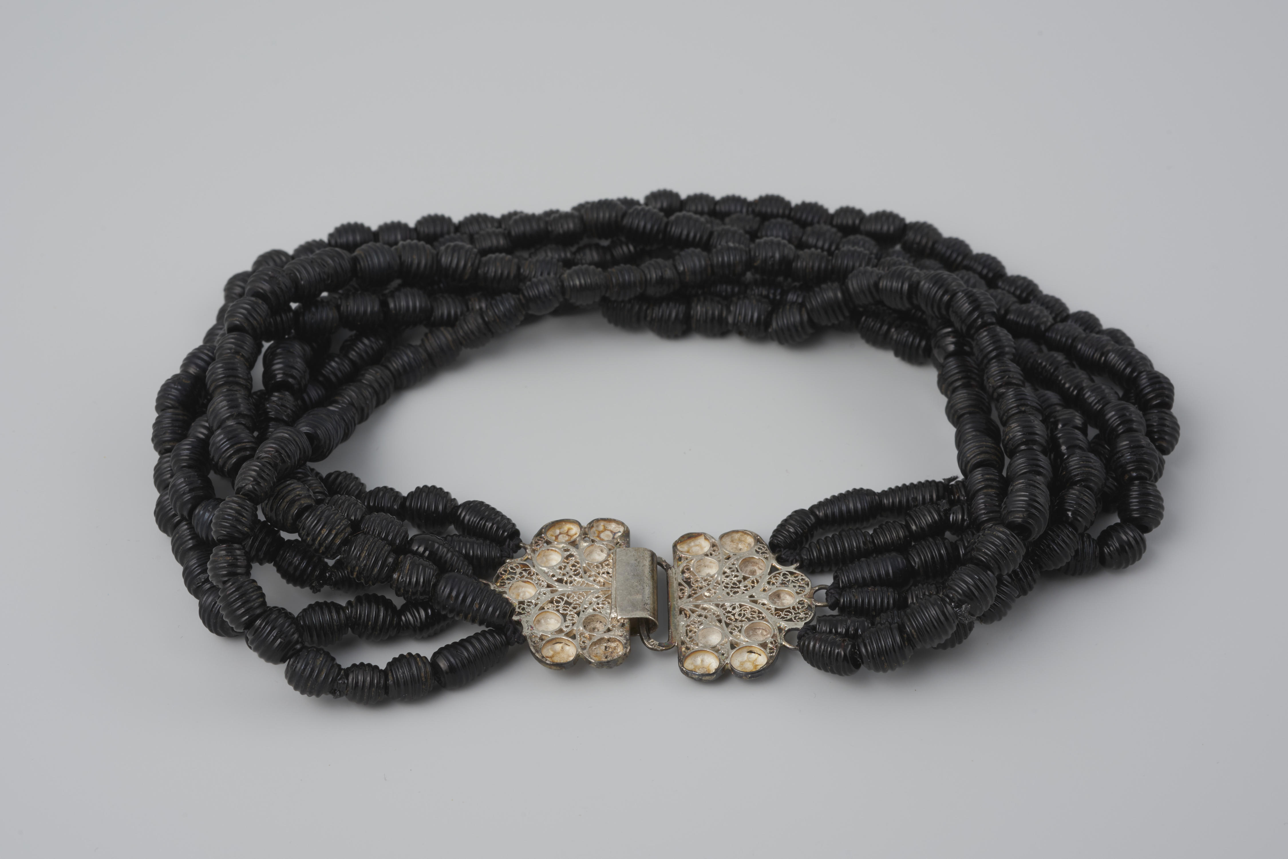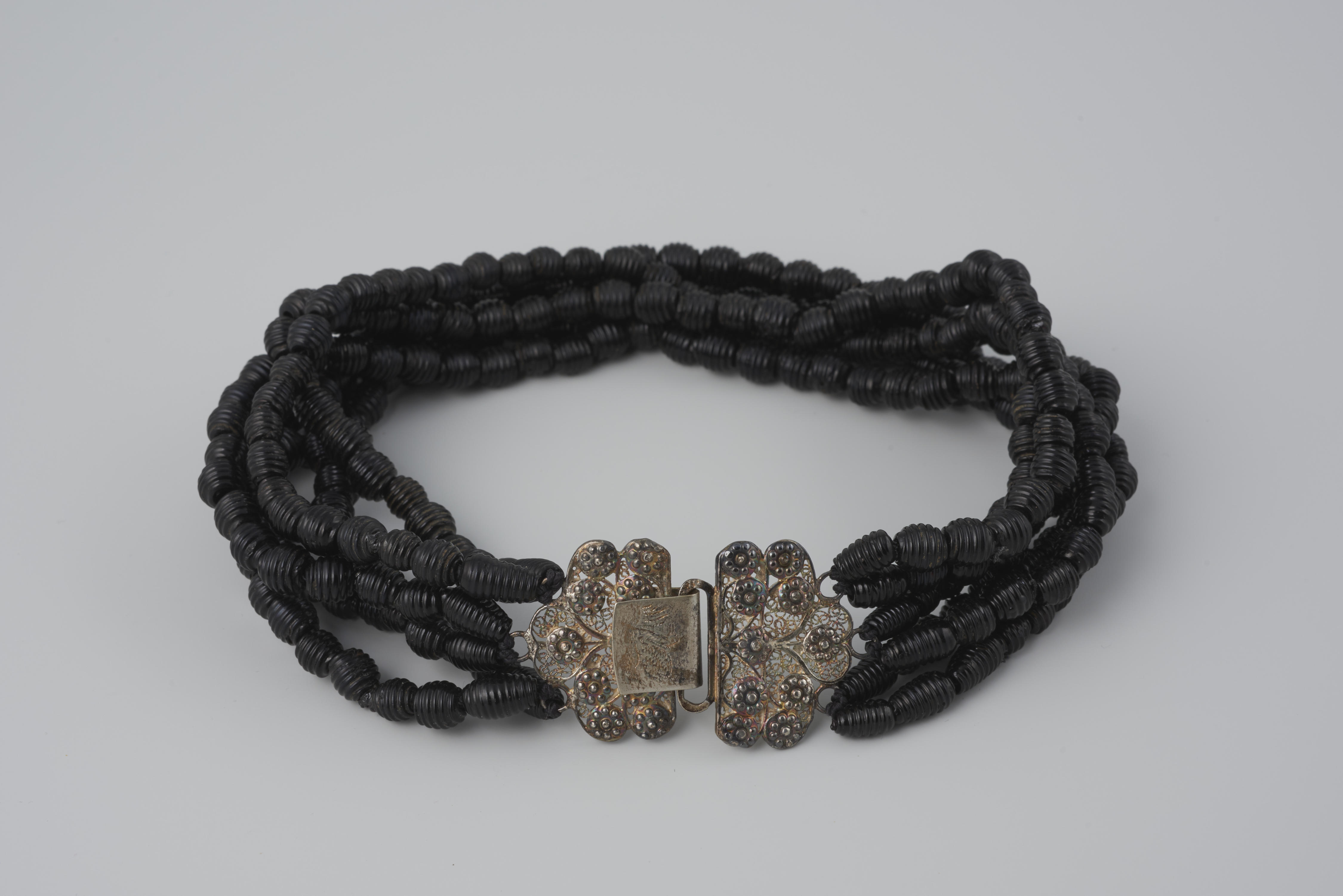 Halssnoer, bestaande uit zes strengen zwarte glazen kralen aan een zilveren slot. Het halssnoer had oorspronkelijk vijf strengen kralen. In het museum is er een zesde streng aan het snoer toegevoegd. Het is gedragen door een meisje van Zuid-Beveland bij de rouwdracht.