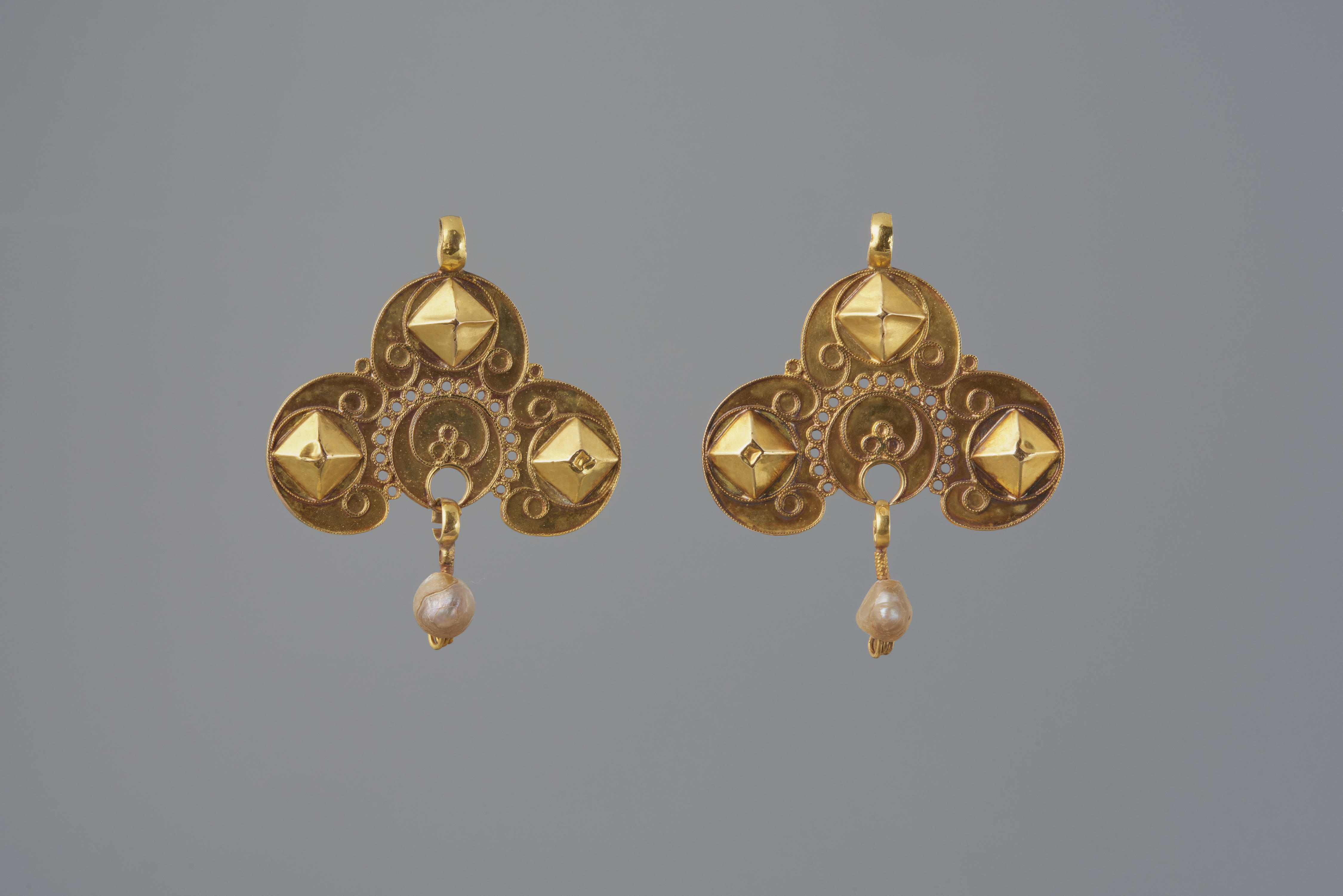 Een paar 14-karaats gouden oorijzerhangers, zogenoemde 'strikken'. Aan de onderzijde van de klaverbladvormige strikken hangt een oesterparel. Deze oorijzerhangers zijn gedragen door een vrouw in streekdracht op Walcheren. Strikken werden aan de krullen van het oorijzer gedragen bij de zondagse dracht en speciale gelegenheden. De strikken hebben aan de voorzijde drie piramidevormige dopjes en aan ...