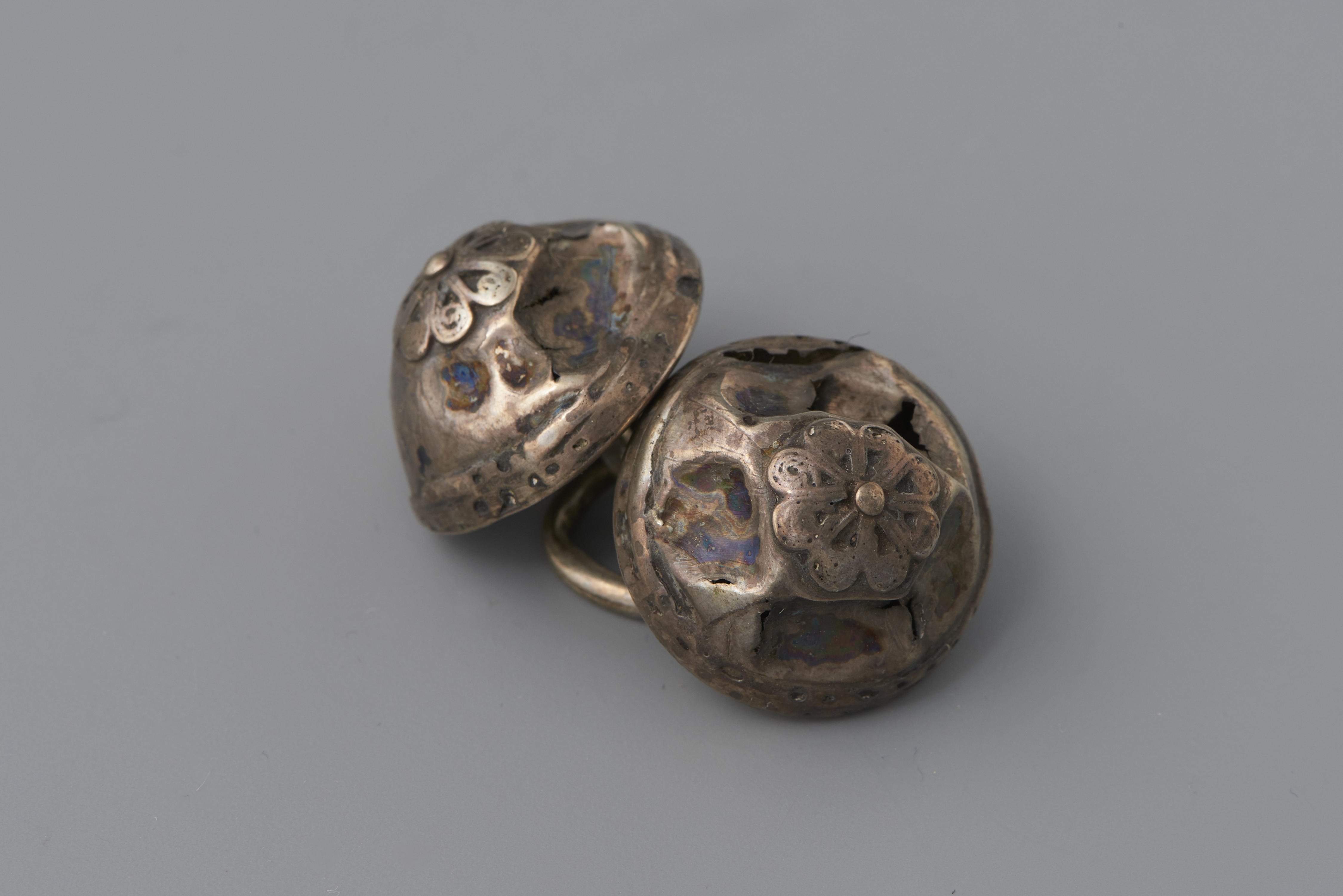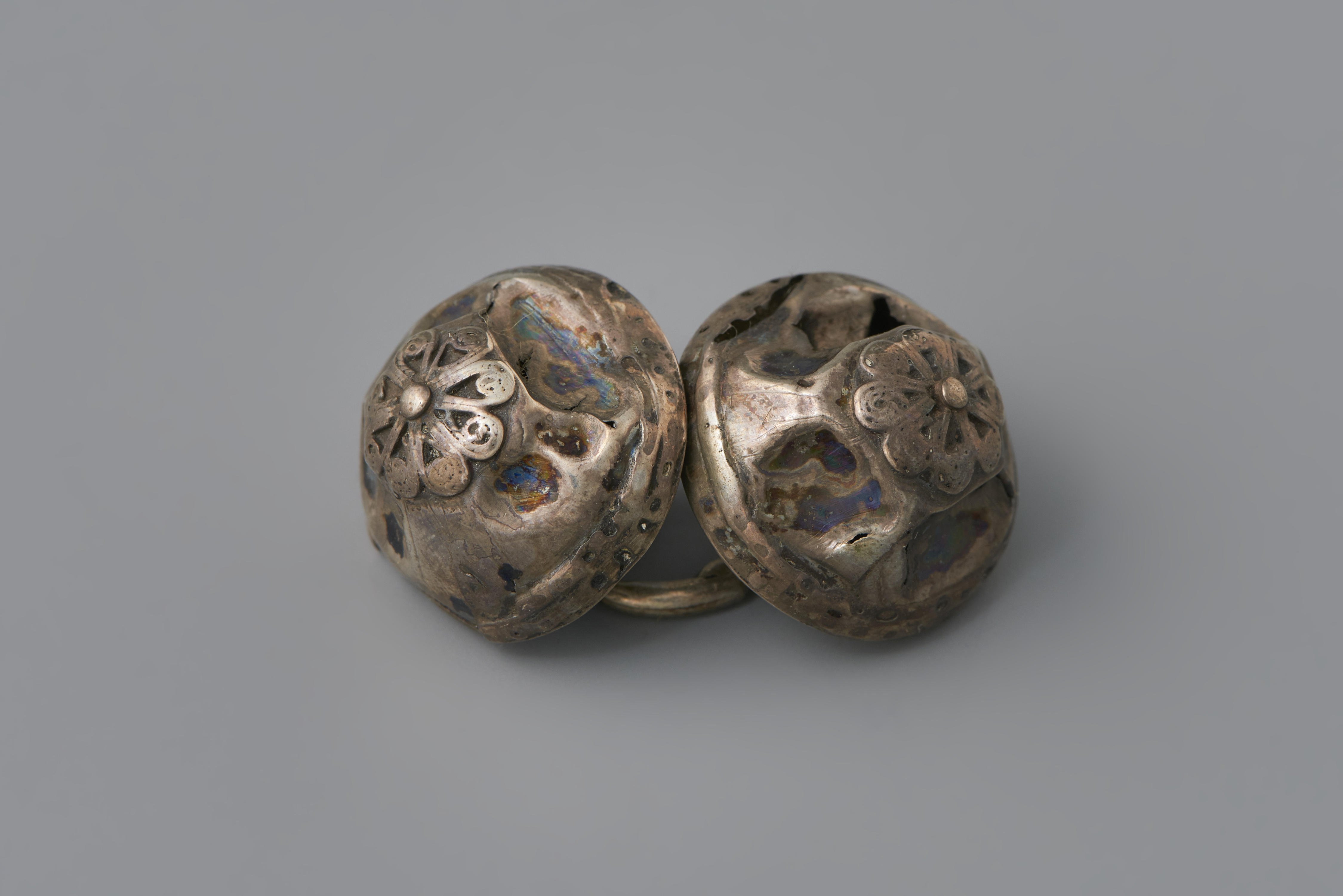 Paar zilveren keelknopen, gemaakt omstreeks 1850-1875. Dit soort knopen werd gedragen door jongens en mannen van het eiland Marken. Keelknopen werden gebruikt om de halsboord van het hemd te sluiten.