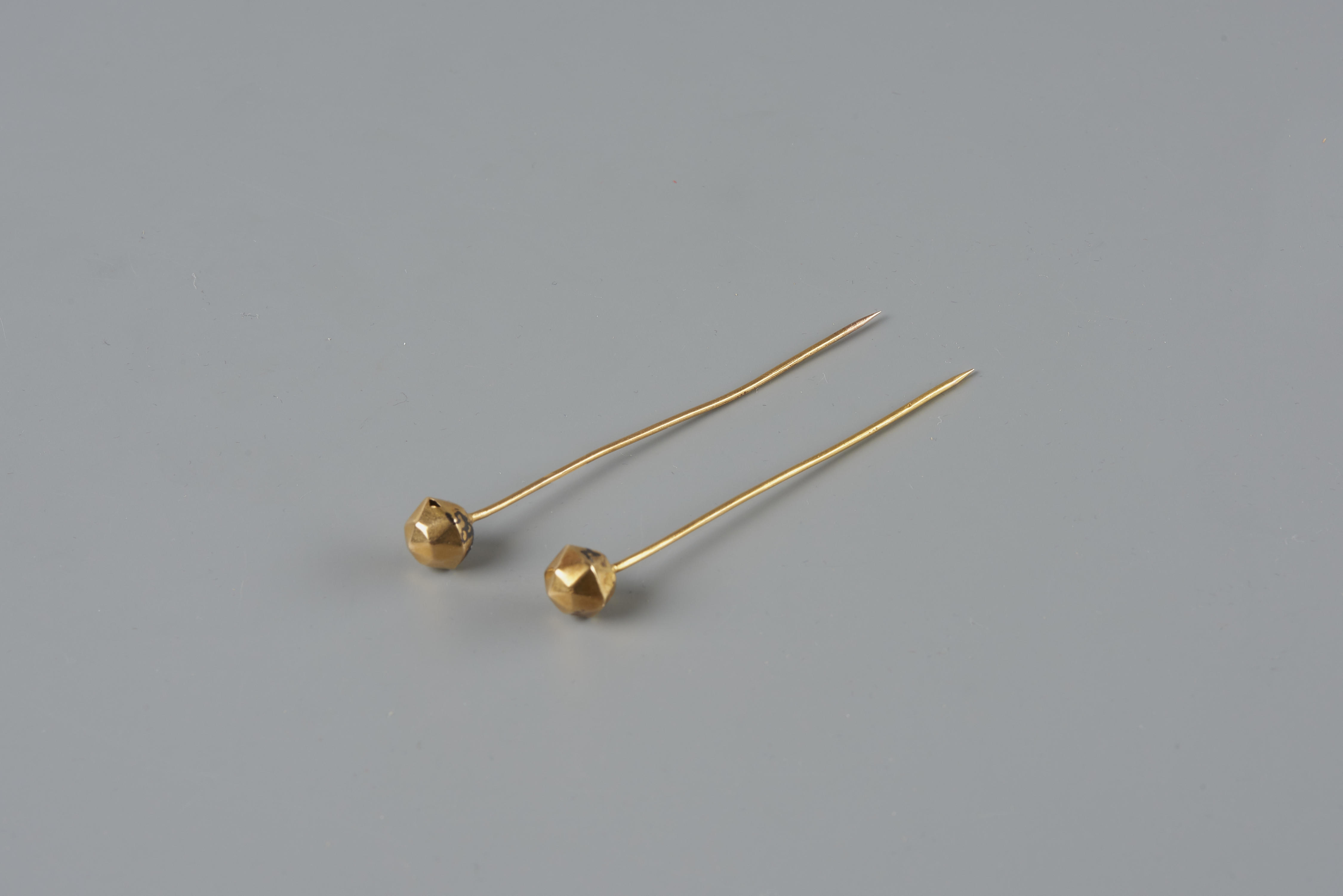 Paar gouden kapspelden, gedragen door een vrouw op Walcheren. De spelden werden opzij in de ondermuts gestoken. Dit model mutsspeld werd op Walcheren 'balspeld' of 'geslepen speld' genoemd.