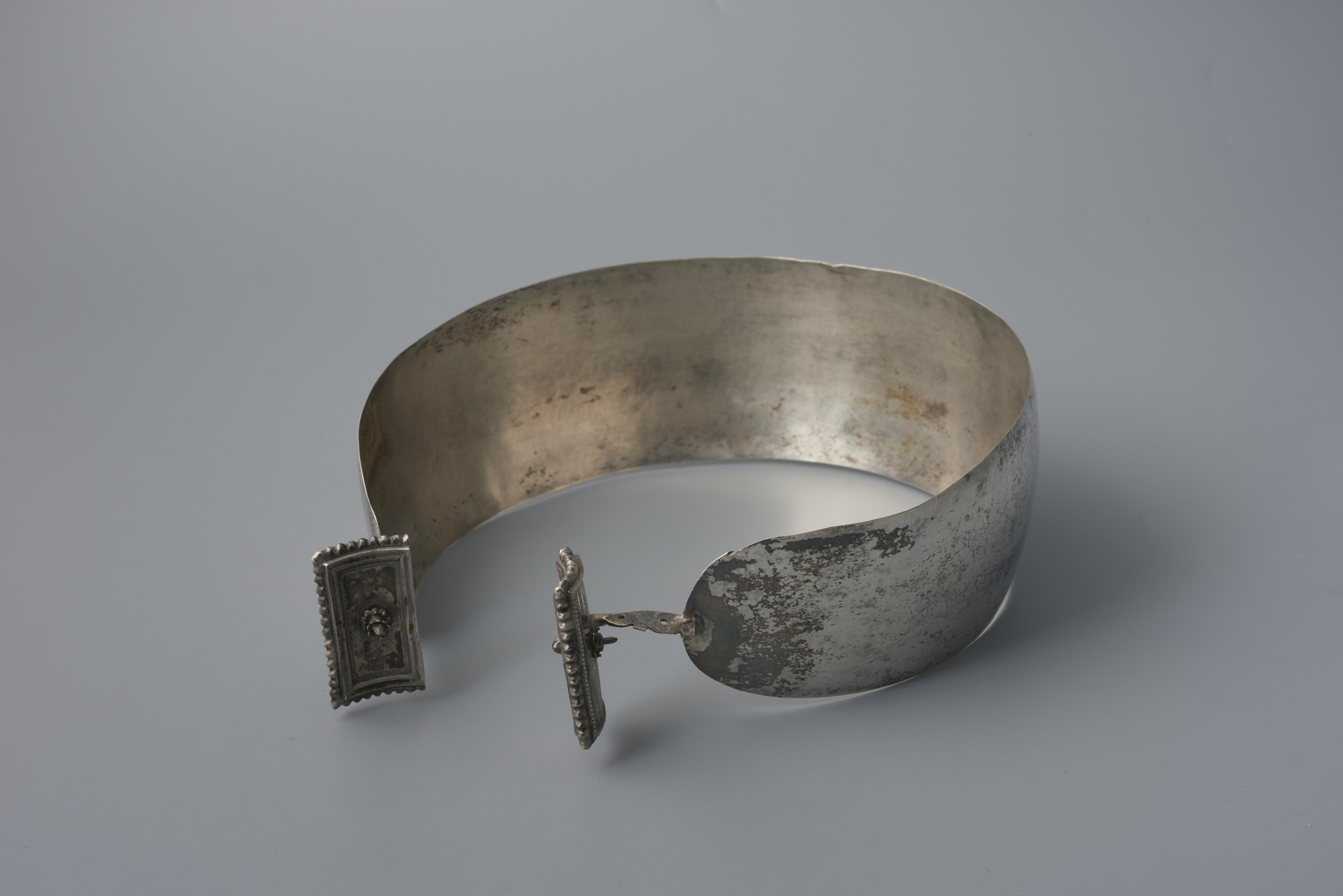Zilveren oorijzer, gedragen door een vrouw in streekdracht uit Noord-Holland. In het verbindingsstuk tussen de beugel en de boeken zitten twee gaatjes. Hierdoor kunnen spelden worden gestoken die de muts en het oorijzer aan elkaar bevestigen. De beugel is in 1896 vervaardigd door de edelsmeden J. Spel en J.F. Schiffel in Hoorn. Aan de beugel ...