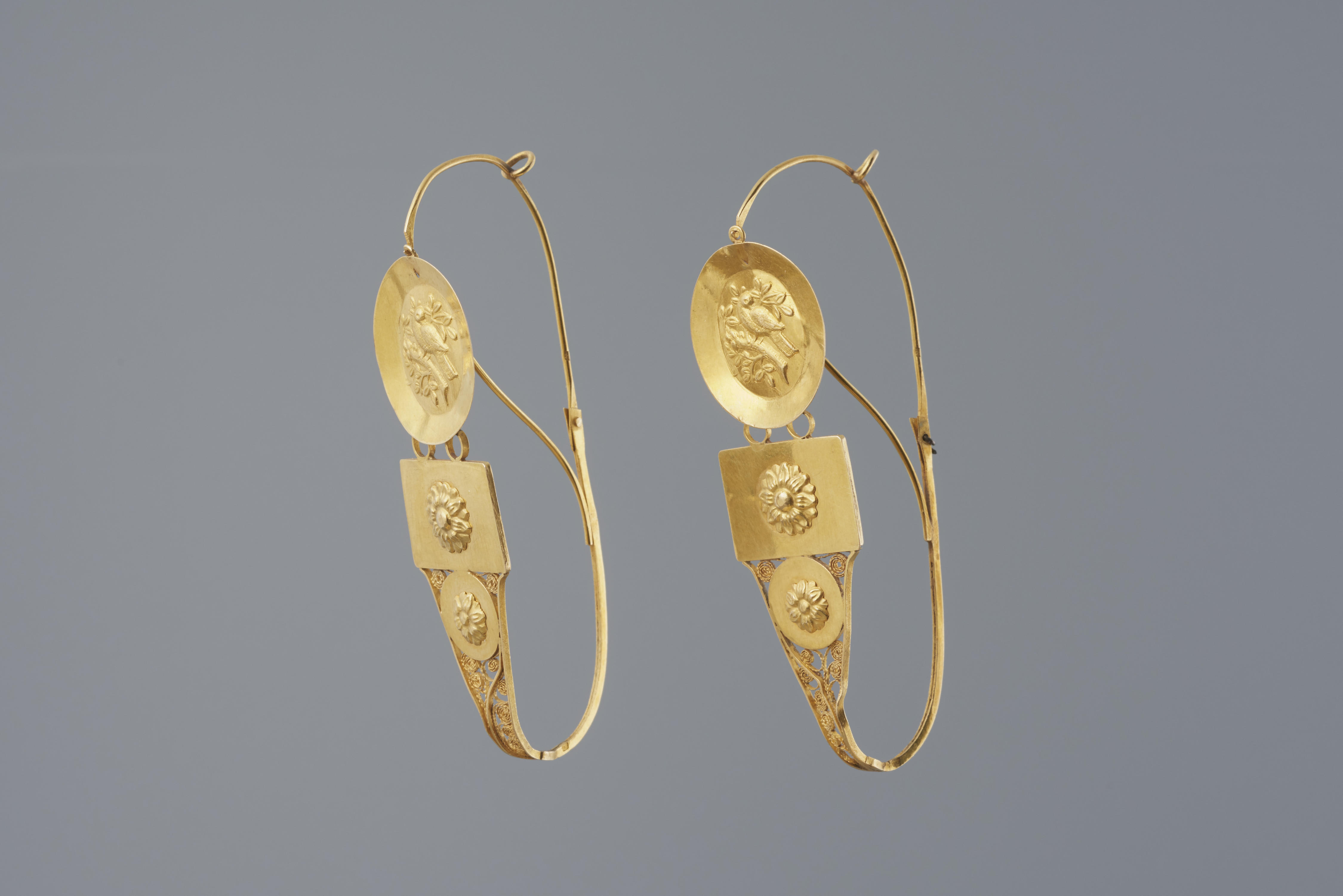Paar 18-karaats gouden oorhangers, deels versierd in filigreintechniek. De oorhangers zijn gedragen door een vrouw uit de provincie Friesland. De vervaardiger is onbekend. De hangers hebben een gehaltemerk dat gebruikt is na 1955, dus mogelijk zijn ze herkeurd.