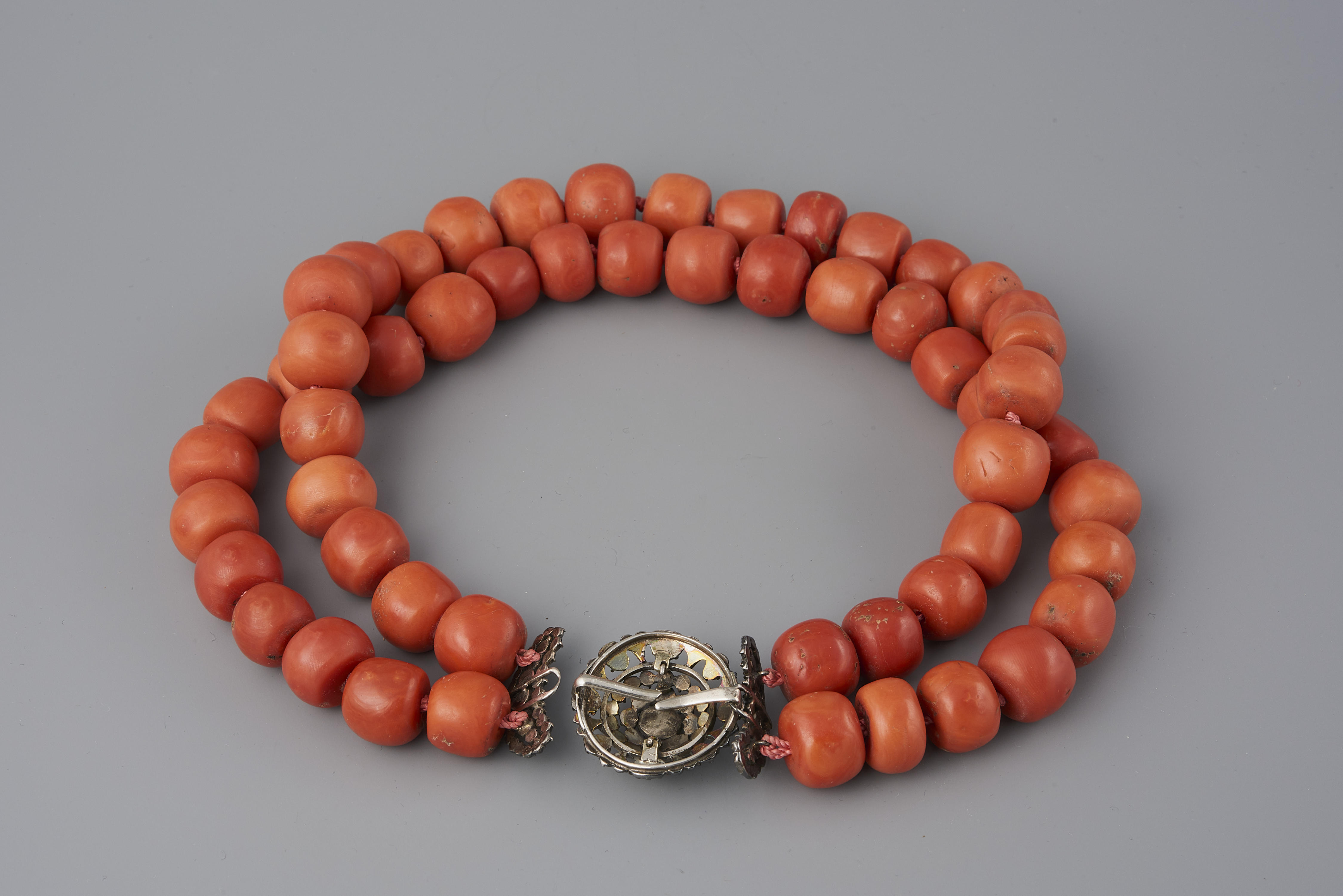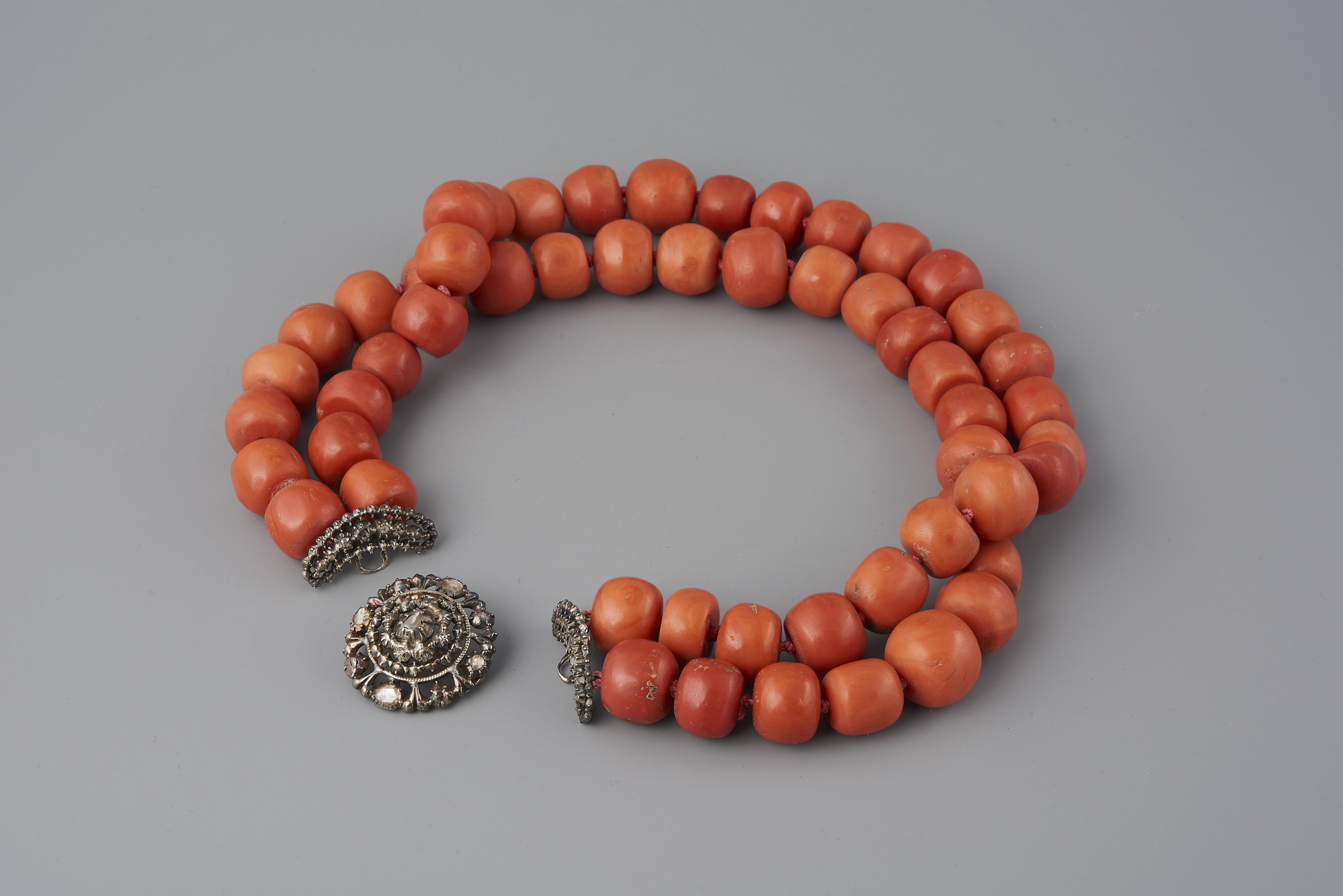 Halssnoer, bestaande uit een zilveren slot ingelegd met diamanten en twee strengen forse kralen van bloedkoraal. Het slot is in 1949 verworven zonder kralen. In het museum is het van kralen voorzien. Het slot is gedragen door een vrouw uit Noord-Holland. De vervaardiger is onbekend.