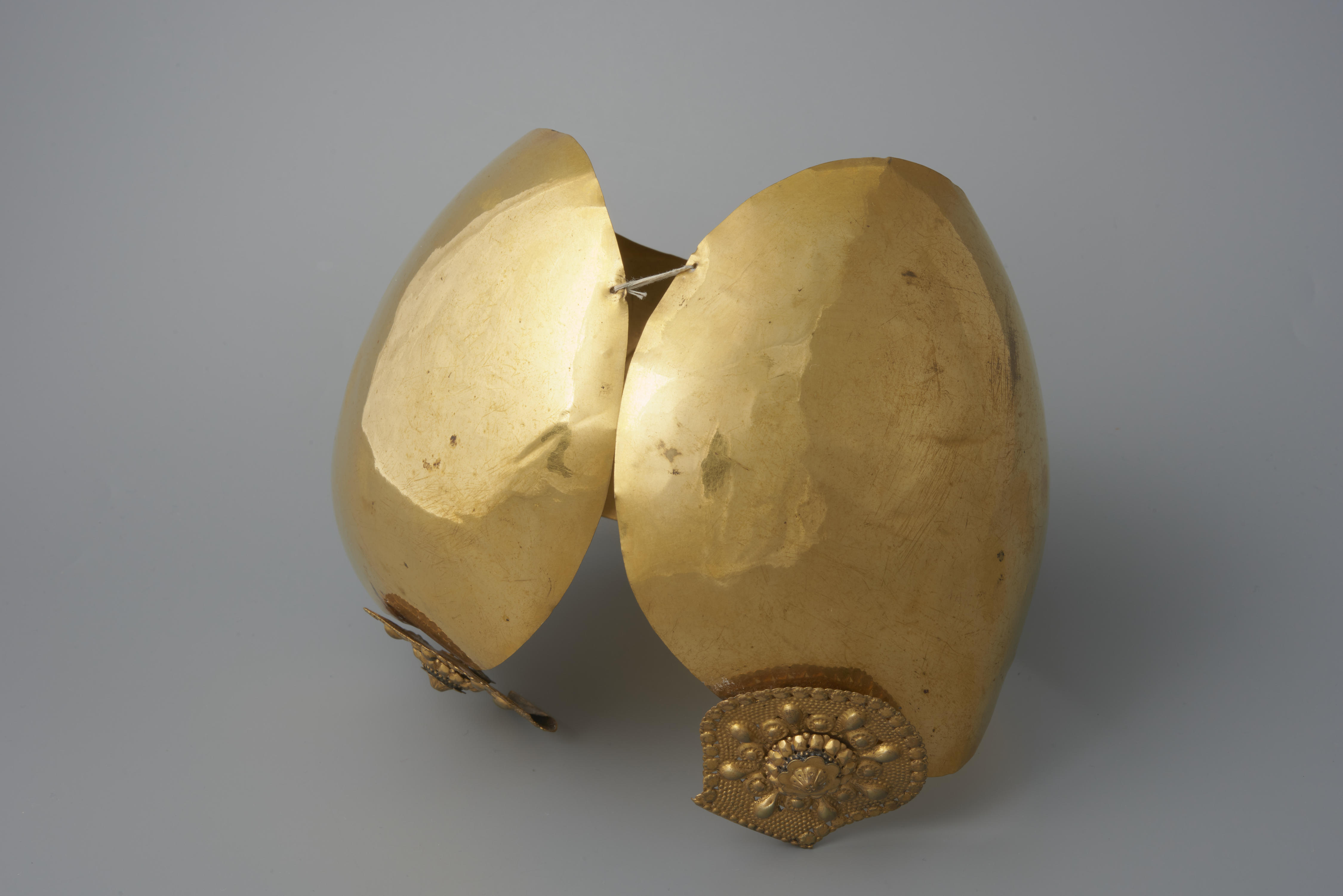Verguld messing oorijzer met vergulde messing stiften, gedragen door een vrouw in streekdracht uit Friesland. Aan de rand van de beugel zijn de initialen G.J.H. (?) gegraveerd. Het verbindingskettinkje aan de bovenzijde ontbreekt. Mogelijk zijn er replicastiften aan een oudere oorijzerbeugel gezet.