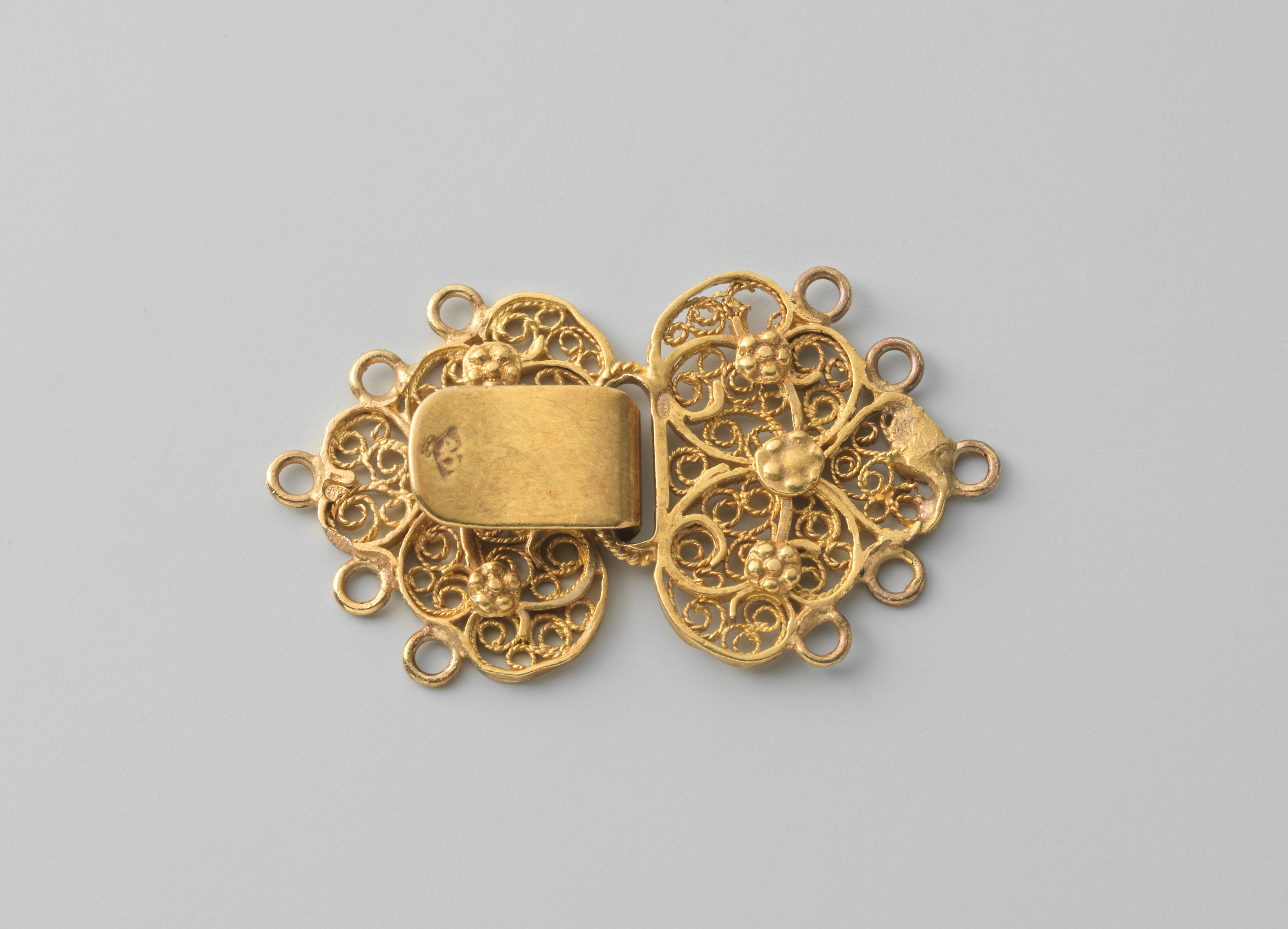 Een 18-karaats gouden haak en oog, gebruikt voor het sluiten van de achterlinten van een kaphoed en gedragen door een meisje of vrouw in streekdracht van het eiland Walcheren. Het meesterteken lijkt op dat van A. Ooms en Zoon, werkzaam in Middelburg en Zierikzee tussen 1814 en 1844. Toen de kaphoeden aan het eind van ...