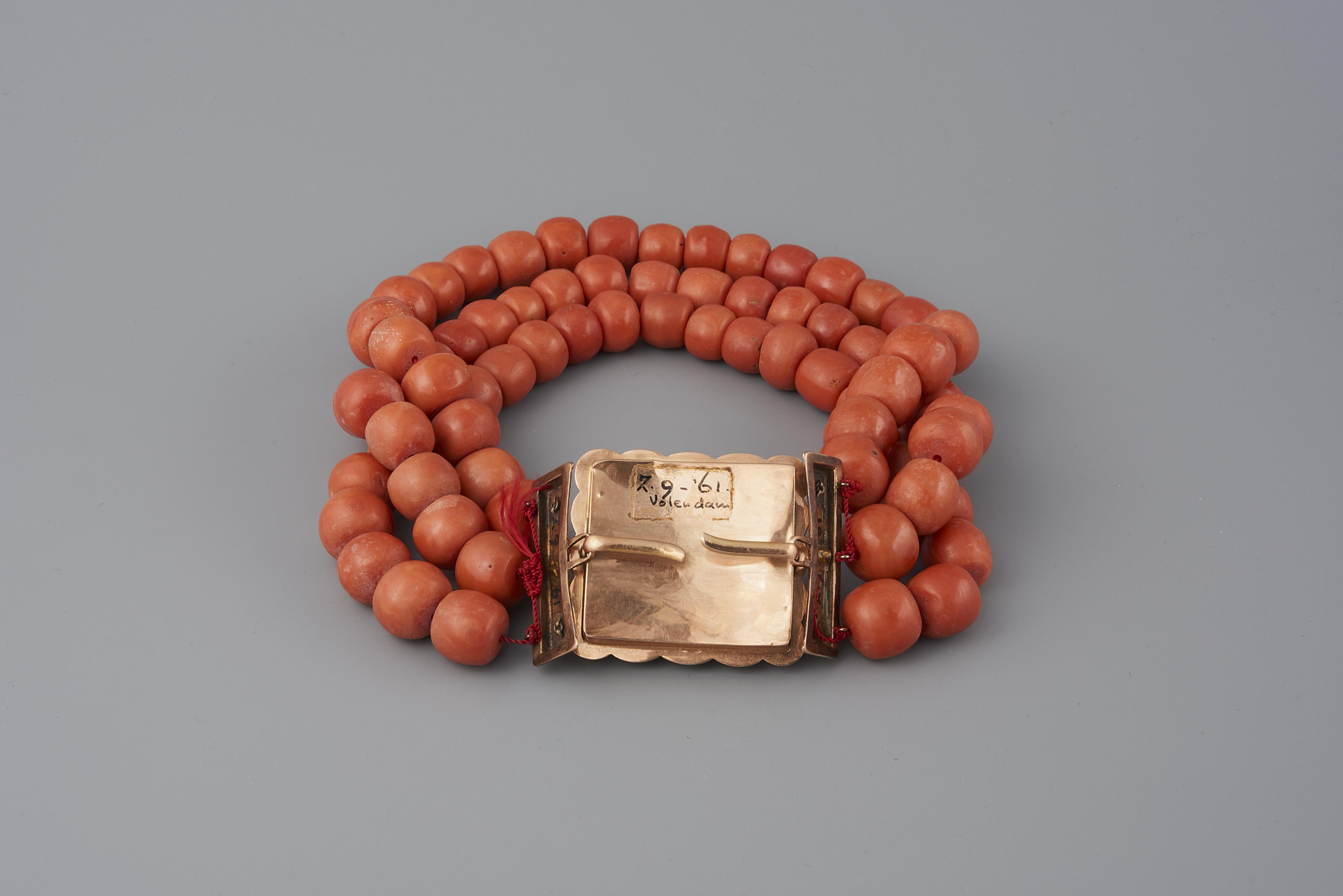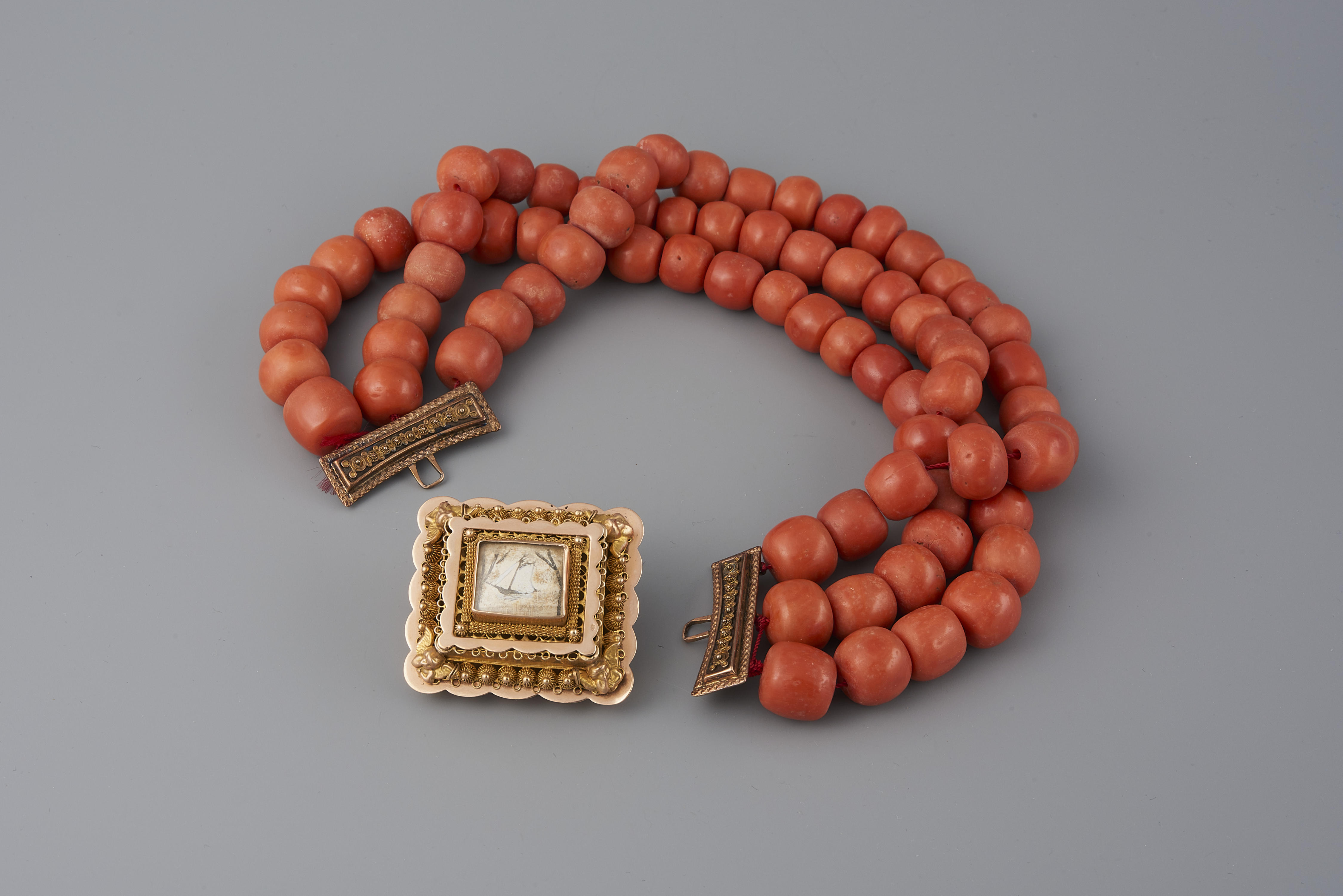 Halssnoer, bestaande uit een 14-karaats gouden slot met voorstelling van een scheepje in haarwerk en drie strengen kralen van bloedkoraal. Het slot is gedragen door een vrouw uit Volendam. De kralen die oorspronkelijk aan dit slot waren bevestigd zijn in het museum verwisseld. Het slot is tussen 1874 en 1923 vervaardigd door de gebroeders Rozendaal ...