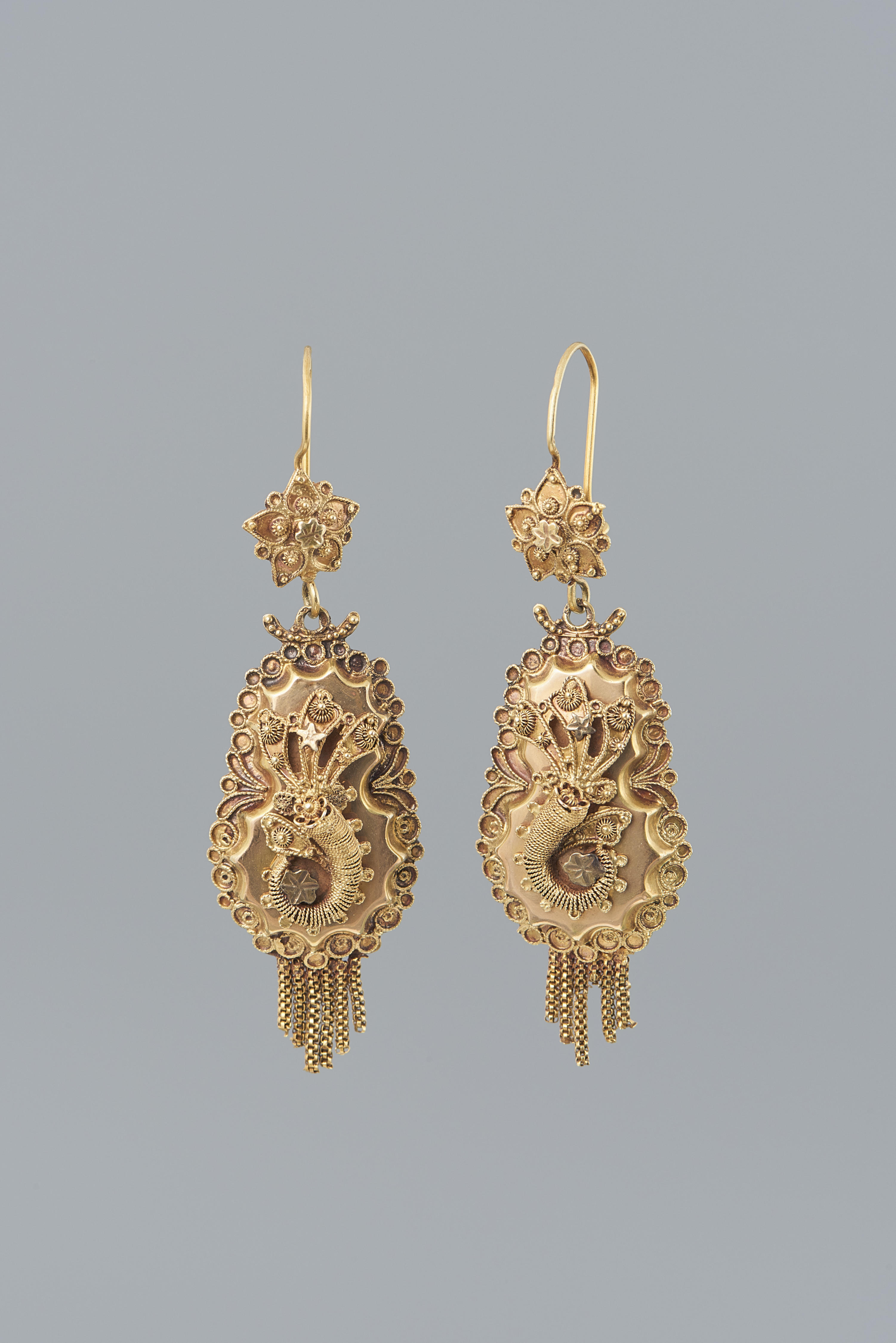 Paar 14-karaats gouden mutsenbellen, gedragen door een vrouw uit Rijssen. Dergelijke mutsenbellen werden in de voorstrook van de kornetmuts gehaakt. De vervaardiger is onbekend. De mutsenbellen hebben een gehaltemerk dat gebruikt is tussen 1906 en 1953.