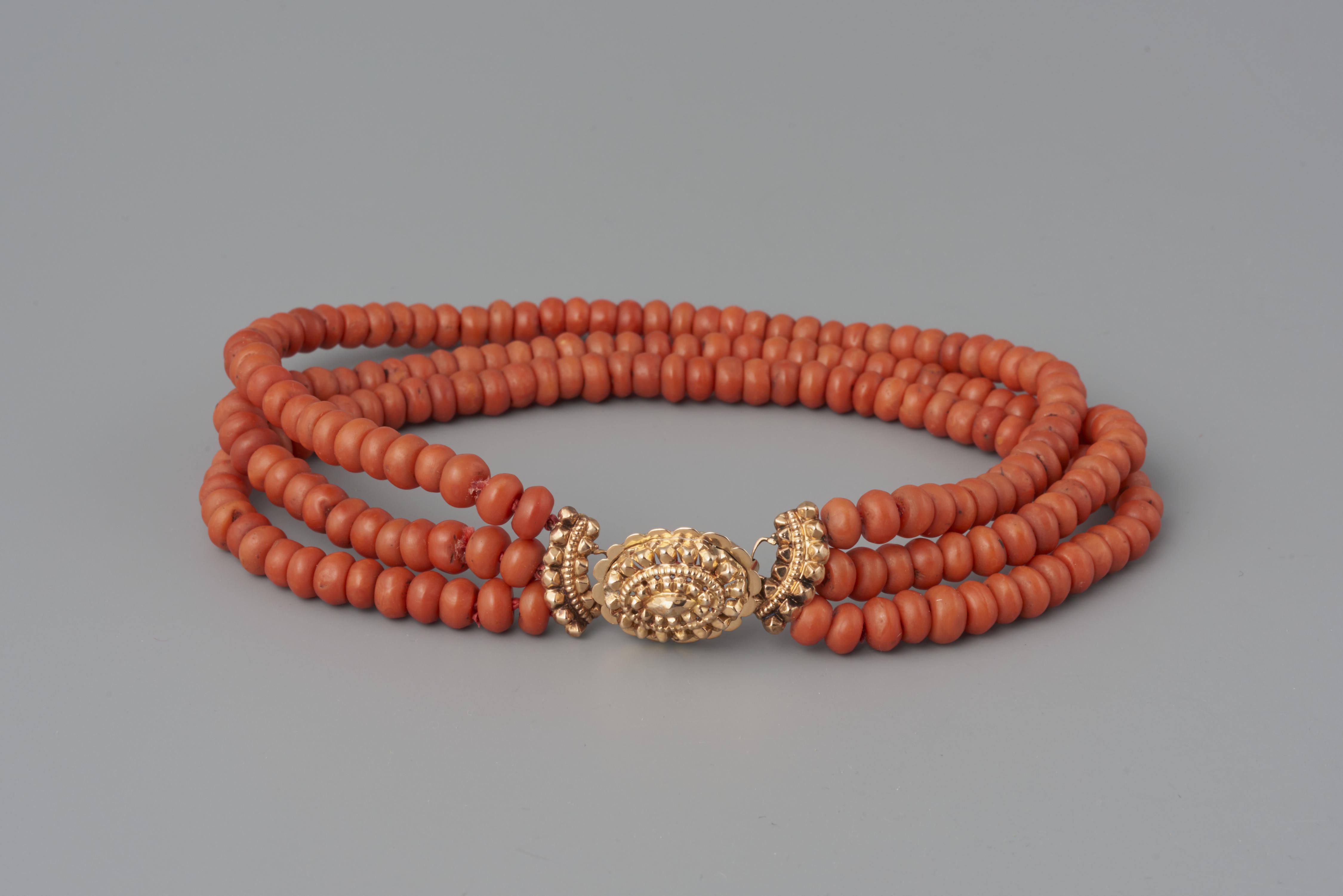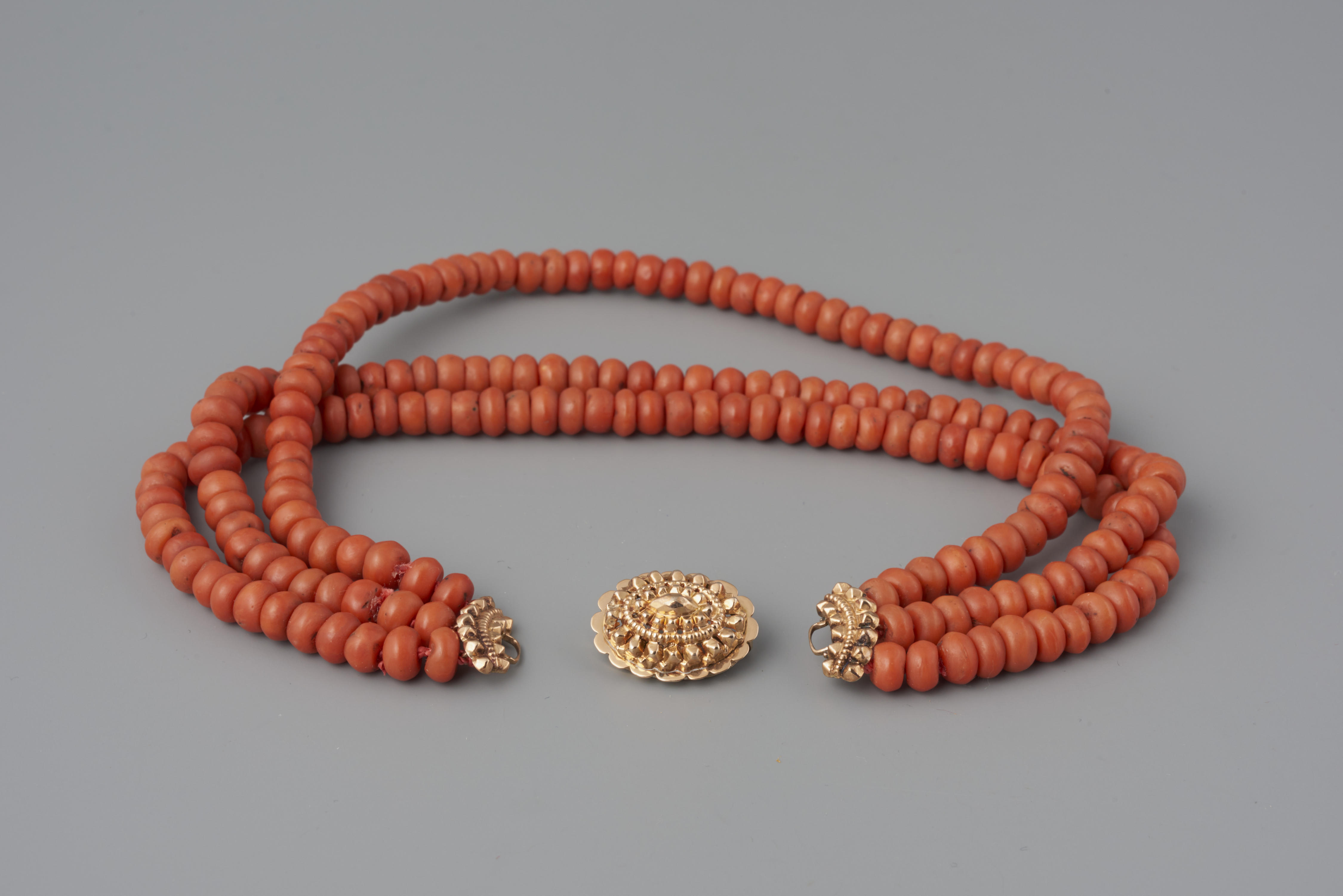 Halssnoer, bestaande uit een 14-karaats gouden slot en drie strengen kralen van bloedkoraal. Het halssnoer is gedragen door een meisje uit Volendam. De vervaardiger is onbekend. Het slot heeft een gehaltemerk dat gebruikt is tussen 1853 en 1906.