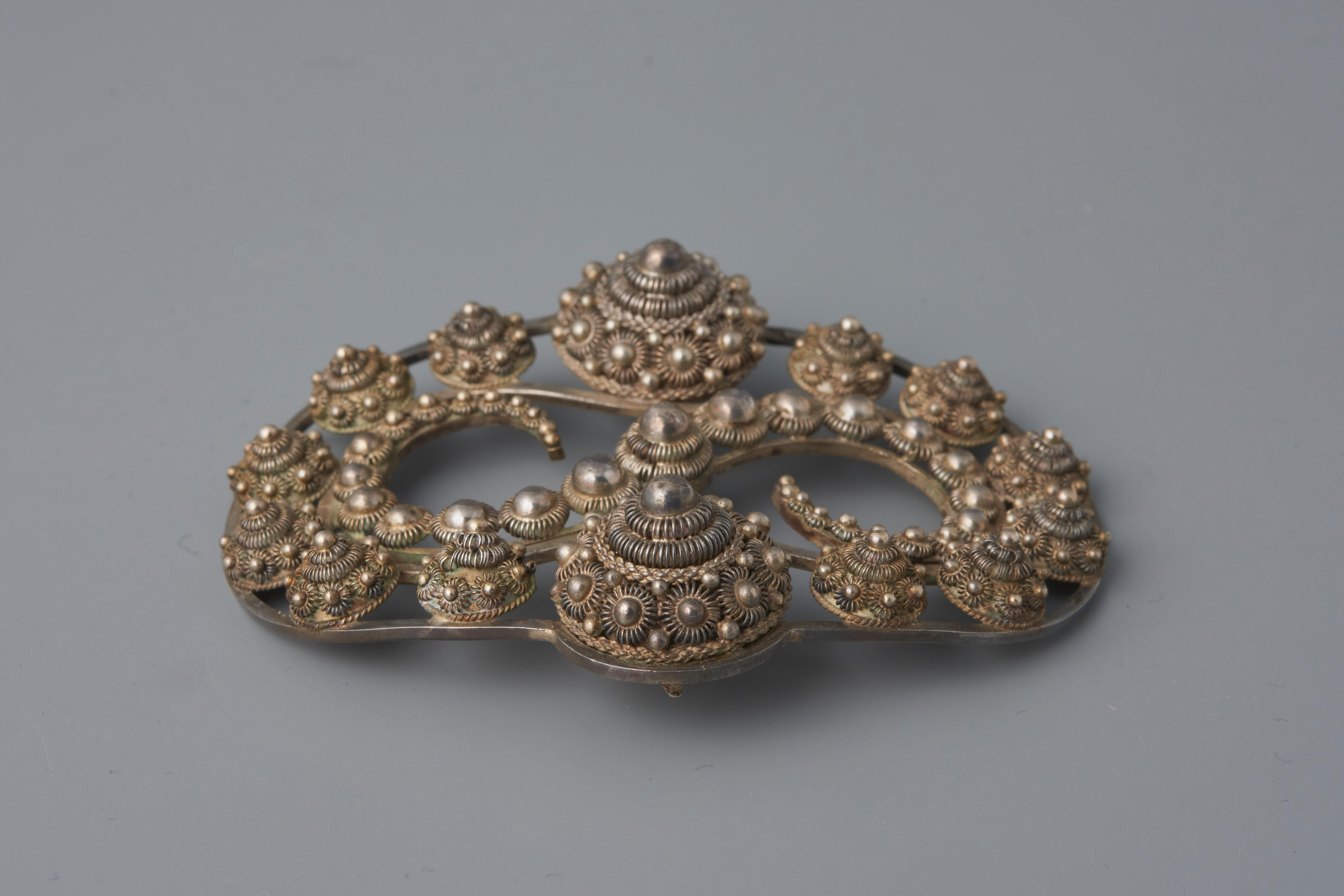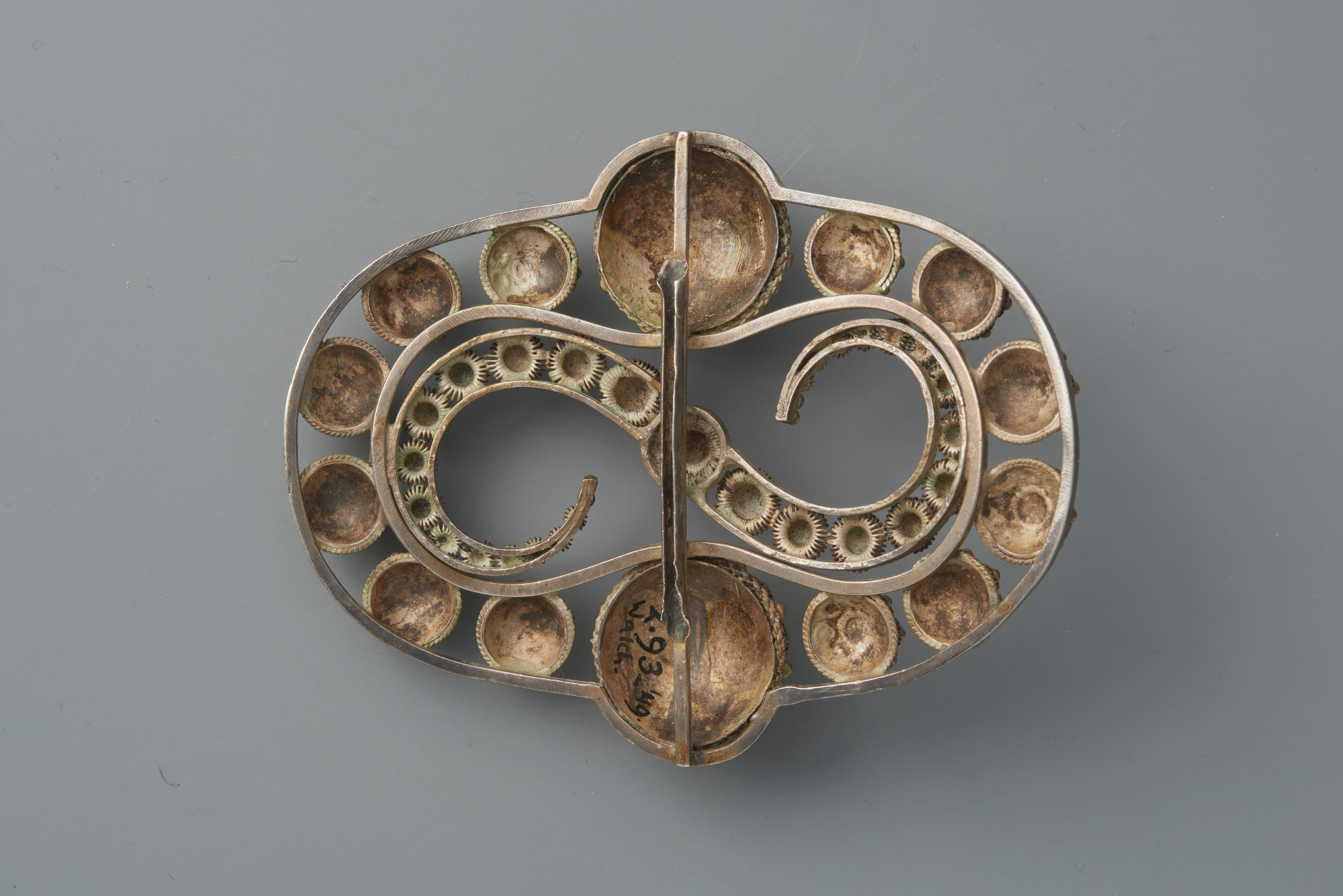 Een zilveren ceintuurgesp, gedragen op een ceintuur door een meisje of vrouw in streekdracht van Walcheren. Er staan geen merken in de gesp.