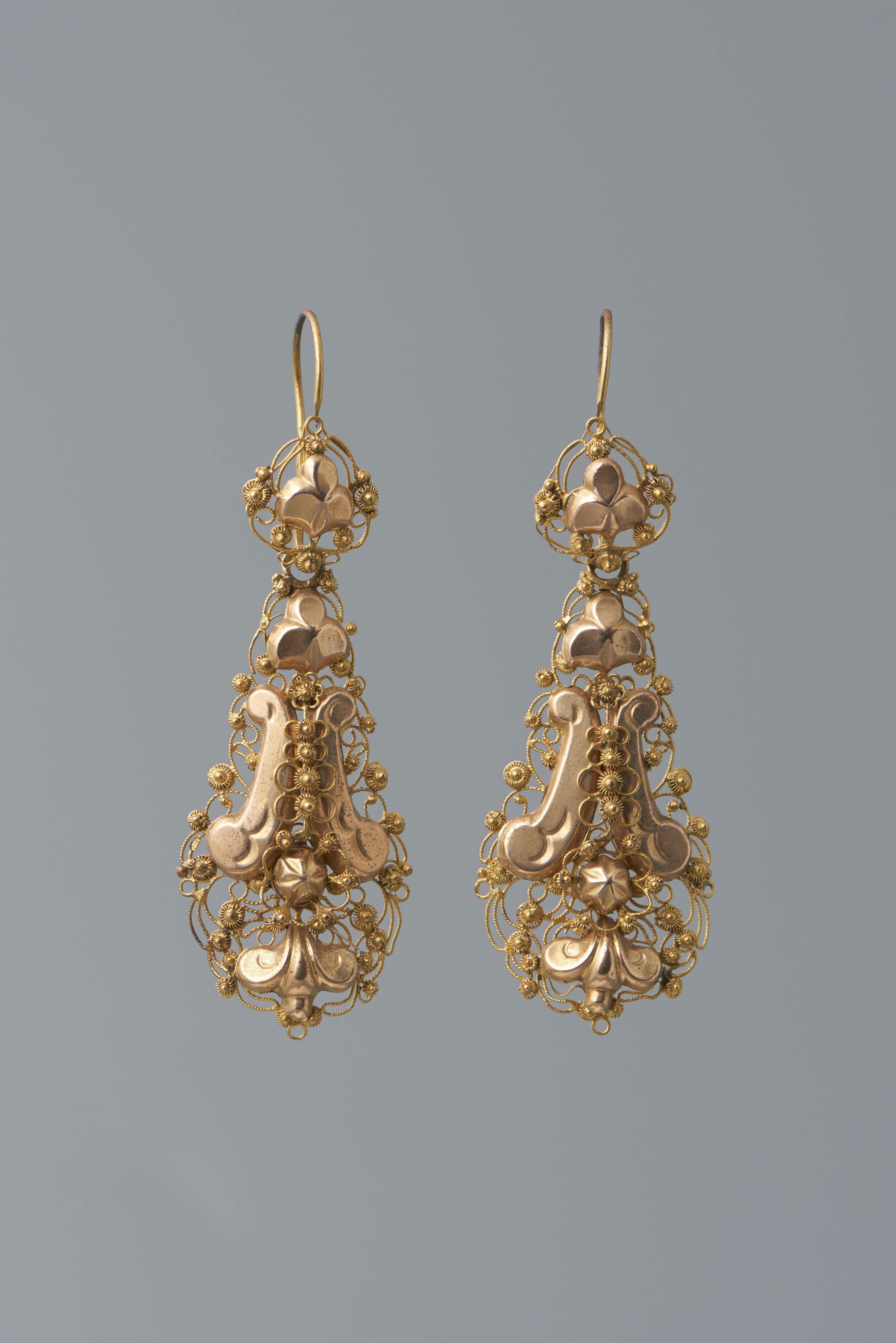 Paar 14-karaats gouden mutsenbellen, gedragen door een vrouw uit Markelo. De mutsenbellen werden in de voorstrook van de kornetmuts gehaakt. Dit type was niet streekgebonden, maar werd in diverse gebieden in Nederland gedragen. Deze bellen zijn tussen 1868 en 1888 vervaardigd door N.S. Visser & Co in 's-Hertogenbosch.
