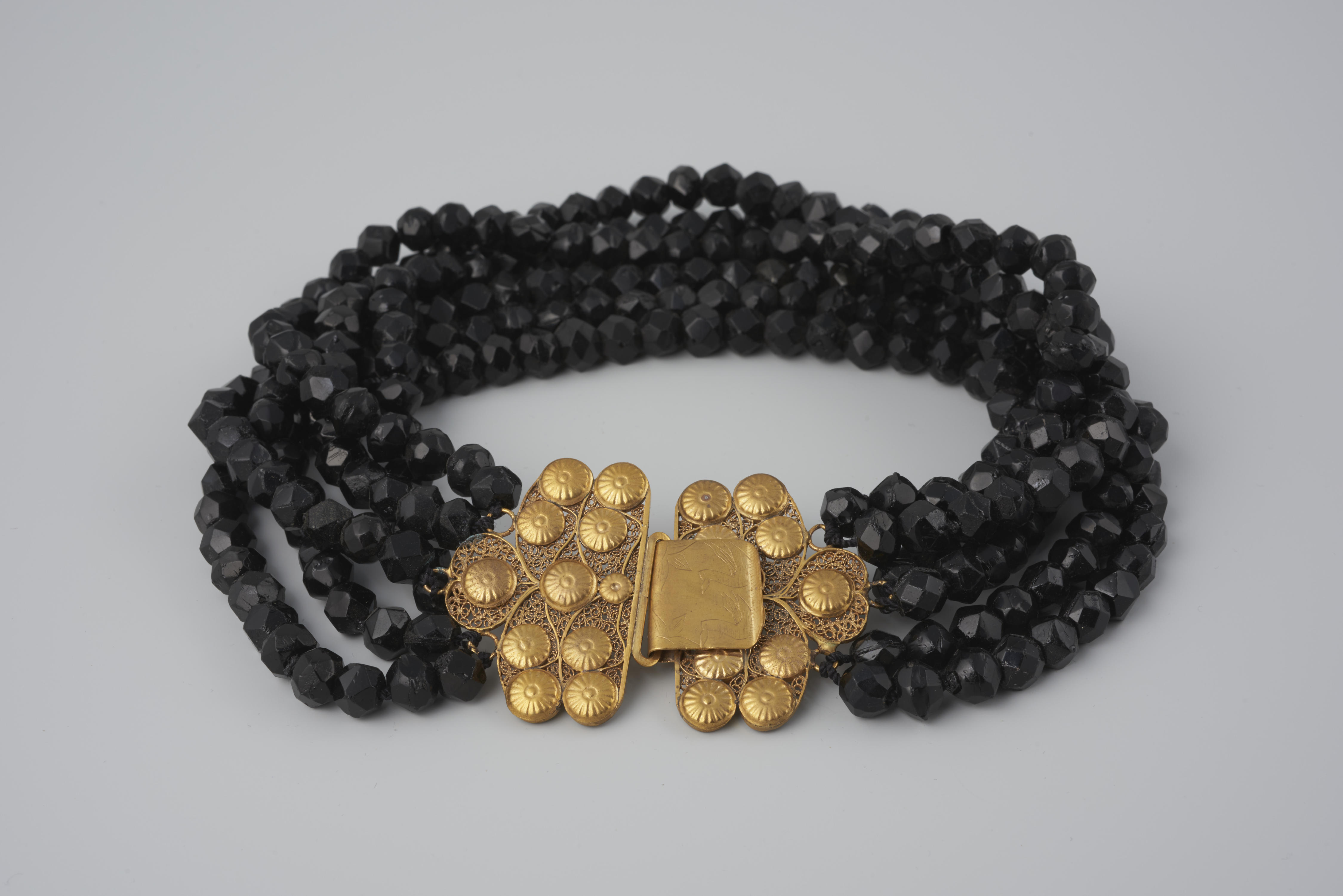 Halssnoer, bestaande uit zes strengen gefaceteerde zwarte glazen kralen aan een verguld messing 'kraalhaak' (slot). De kraalhaak is in 1953 zonder kralen door het museum verworven. In 1955 zijn passende kralen gevonden en aan de haak gezet. De kraalhaak zou gedragen kunnen zijn bij de rouwdracht door een rooms-katholieke vrouw van Zuid-Beveland. De vervaardiger is ...