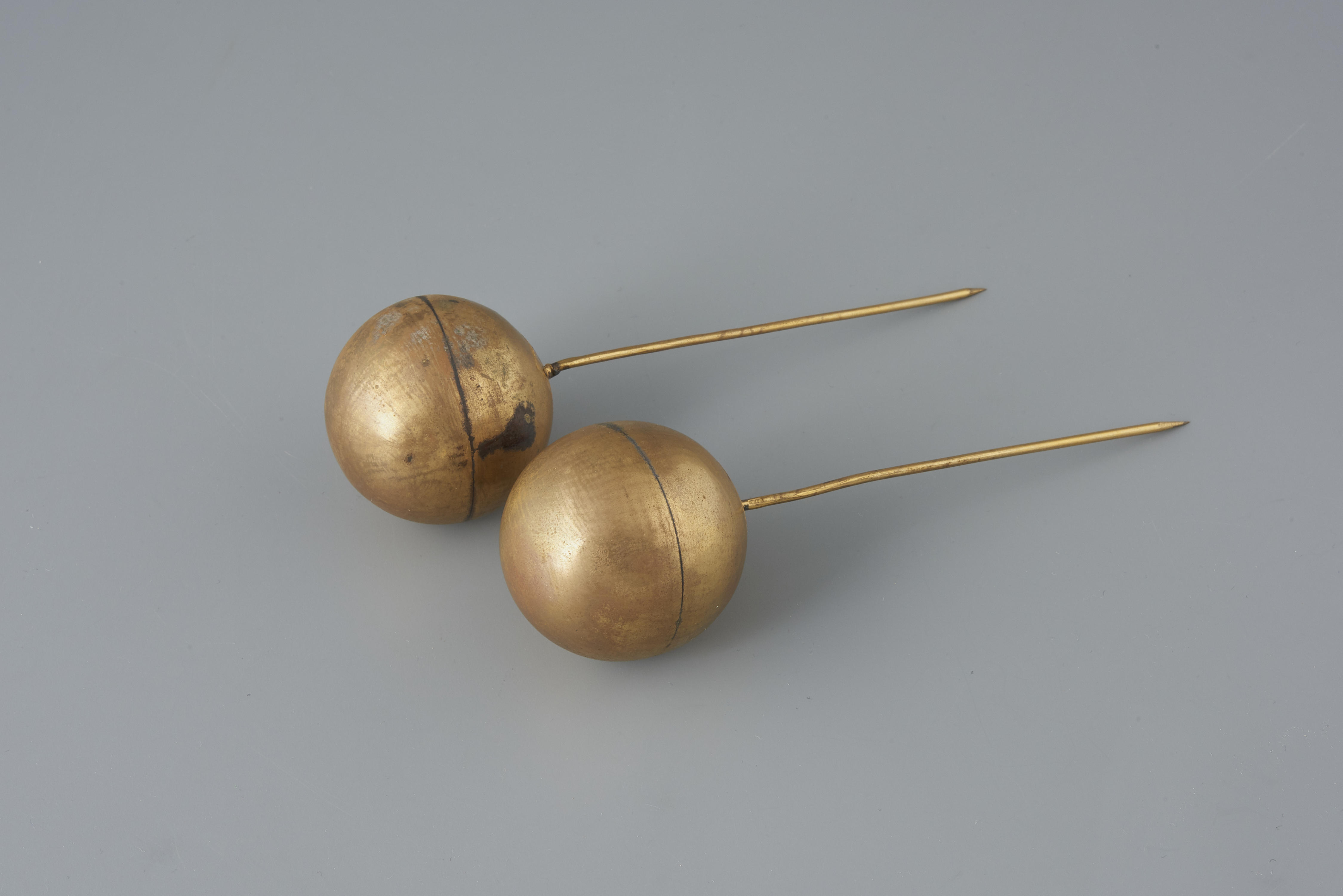 Paar vergulde messing 'bolspelden'. Dergelijke mutsspelden zijn de gehele negentiende eeuw op Zuid-Beveland gedragen en omstreeks 1915 uit de mode geraakt. In de loop van de tijd zijn de spelden steeds groter geworden. De bolspelden werden in de ondermuts gestoken, vlak achter de rechthoekige oorijzeruiteinden (de 'stikken'). Vrijwel iedereen droeg vergulde messing exemplaren. Slechts een ...