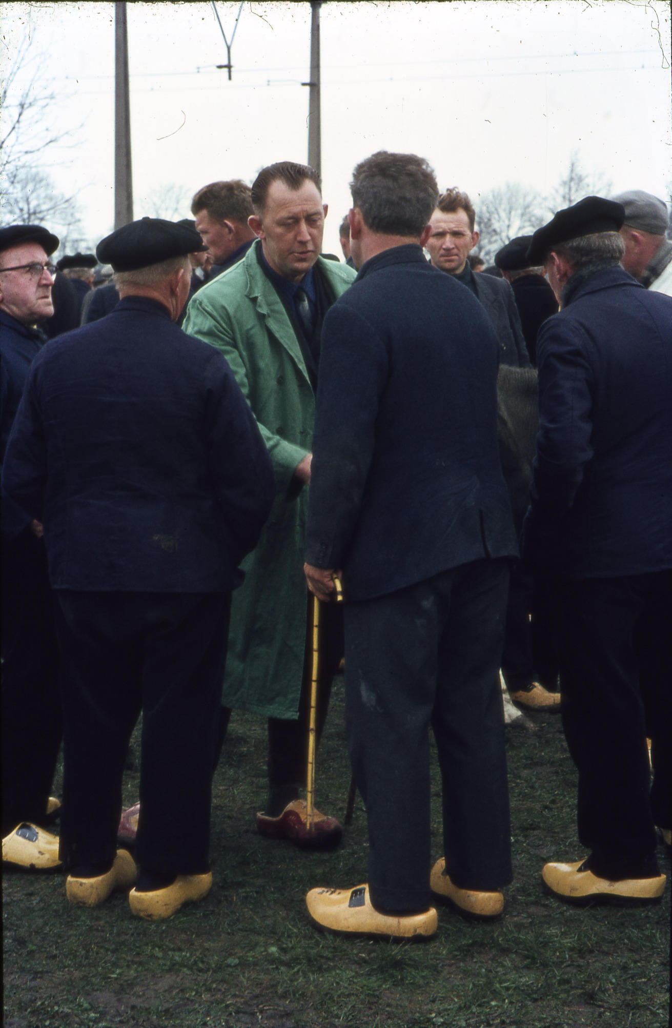 Jaarmarkt in Staphorst op 15 april 1969. De jaarmarkt werd gehouden op een terrein langs de spoorlijn. De man in de groene stofjas is veekoopman Harm Bisschop uit Rouveen. Links staat Jan Compagner ('Jan Evers').