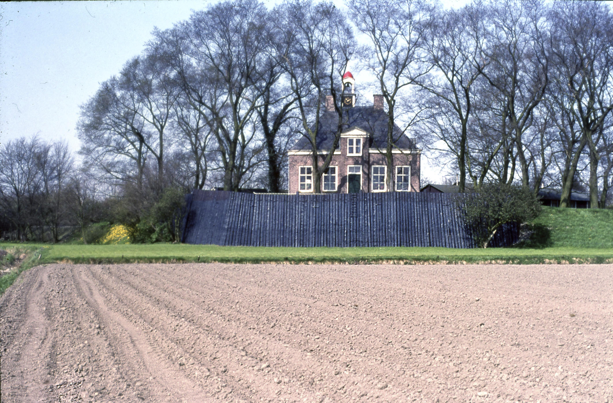 Pastorie met houten zeewering, Schokland, 1971 (diapositief)