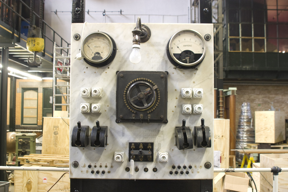 Garbe, Lahmeyer & Co. marmeren schakelbord met gelijkstroomdynamo. Het bord heeft boven aan de voorzijde een voltmeter tot 250 V, een ampèremeter tot 10 A en een witte gloeilamp, vervolgens in het midden een handwiel met acht witte stoppen, en op de onderhelft vier dubbelpolige hefboomschakelaars met bijbehorende fittingen voor zekeringen.