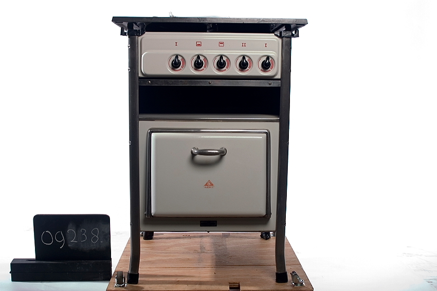 Protos elektrisch fornuis, grijs, 5300W, met gasstel, oven met hendel en vijf zwarte draaiknoppen (alle informatie bij de knoppen is in de rode kleur). Het apparaat rust op vier donkergrijze poten en heeft het rode logo van Protos op de oven staan. Fabr.serienr: 1137.