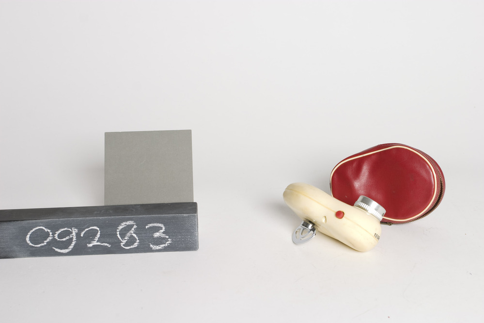 Thorens opwind veermotor scheerapparaat, met één vaste scheerkop die door bajonetsluiting afneembaar is. Het apparaat heeft aandrijving door een veermotor, is in-/uit-schakelbaar door schuif, en heeft een crème kunststof huis met aan de achterzijde opklapbare verchroomde opwindsleutel. Zit in een rood plastic foedraal.