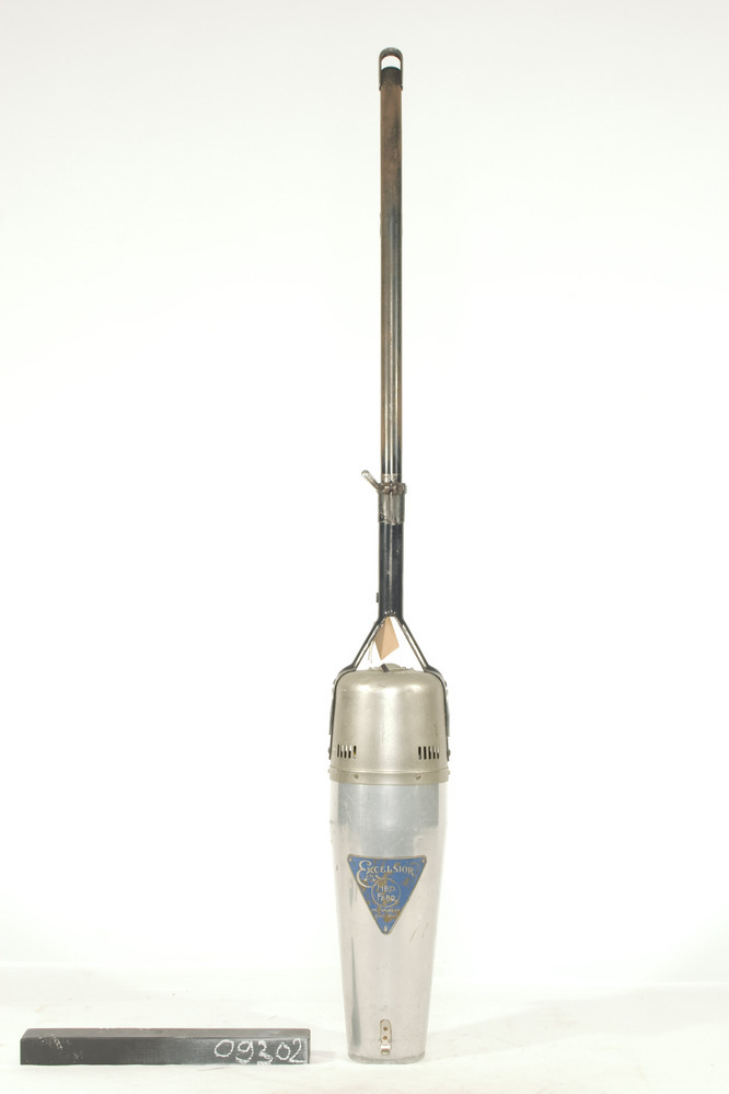 Excelsior elektrische steelstofzuiger, type 903, 220V 215 W, in kokervormige metalen behuizing met steel. Het apparaat heeft op de motor een driekhoekig blauw plaatje met 'Excelsoir NED. FABR. METERFABRIEK DORDRECHT'. serienr. 259479