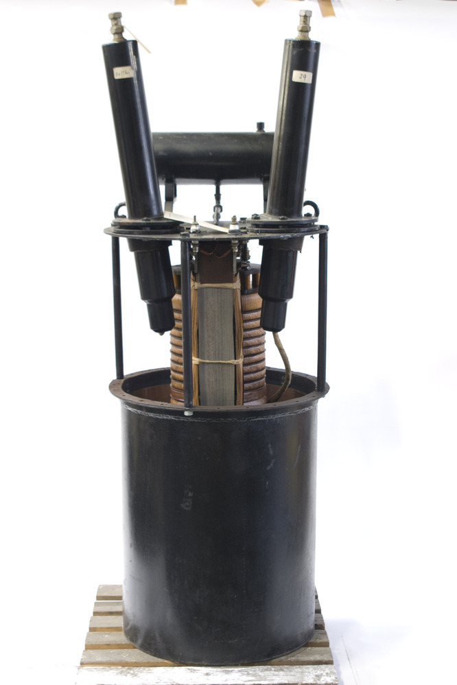 Siemens & Halske spanningstransformator om het meten van hoge spanningen met een gewone voltmeter mogelijk te maken. Het transformeerde maximaal 130000 Volt hoogspanning naar 120 volt en kleinere hoogspanning naar evenredig kleinere laagspanning. Door het meten van de laagspanning kon men aldus de hoogspanning bepalen. De trafo zat in een zwarte cilindrische oliegevulde bak met ...