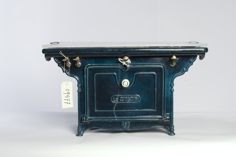 Godin Le Citadin 290 gasfornuis. Blauw geëmailleerd gietijzeren kookoestel met vier koperen kranen en een porseleinen knop in het midden. Het apparaat rust op vier poten. Op het fornuis is een kunststof plaat gemonteerd.
