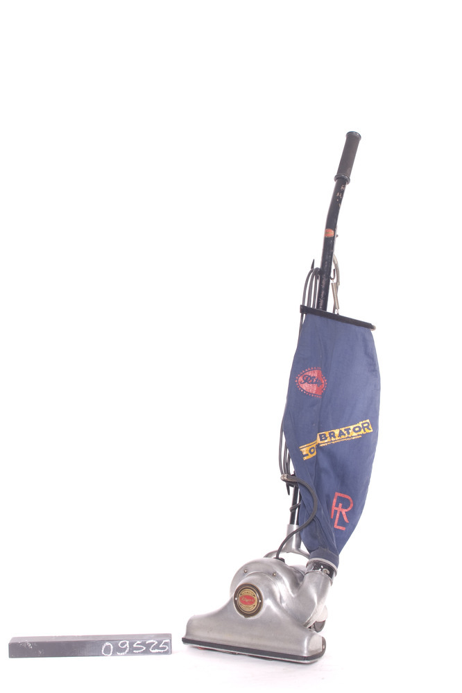 Stofzuiger 220V - 210W. Fabr. serienr: motornr. 152534. Model: rijdend. Besturing: steel. Stofopvang: uitw.stofzak. Kenmerken: horizontaal geplaatst motorhuis met vaste zuigmond waarin rolveger, klemdeksel op zuigmond voor mogelijke slangaansluiting. Hoogte-instelling zuigmond d.m.v. handle werkend op vooras met 2 wielen, 2 vaste achterwielen, vast aansluitsnoer, 2 snoerophang-haken. Kleuren & materialen: aluminium huis met zwart middenstuk, zwarte ...