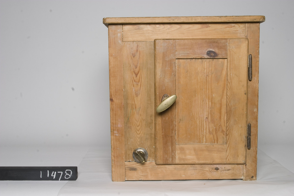 Onbekend fabricaat ijsgekoelde grenenhouten koelkast, met zink bekleed koelvak van 140 liter, dat met een deur kan worden afgesloten. Als koelmiddel worden brokken waterijs gebruikt, die in de naast het koelvak gelegen zinken 40 liter bak worden gedaan. Het smeltende ijs onttrekt zijn smeltwarmte via de zinken tussenwand aan het koelvak. Het smeltwater wordt onder ...