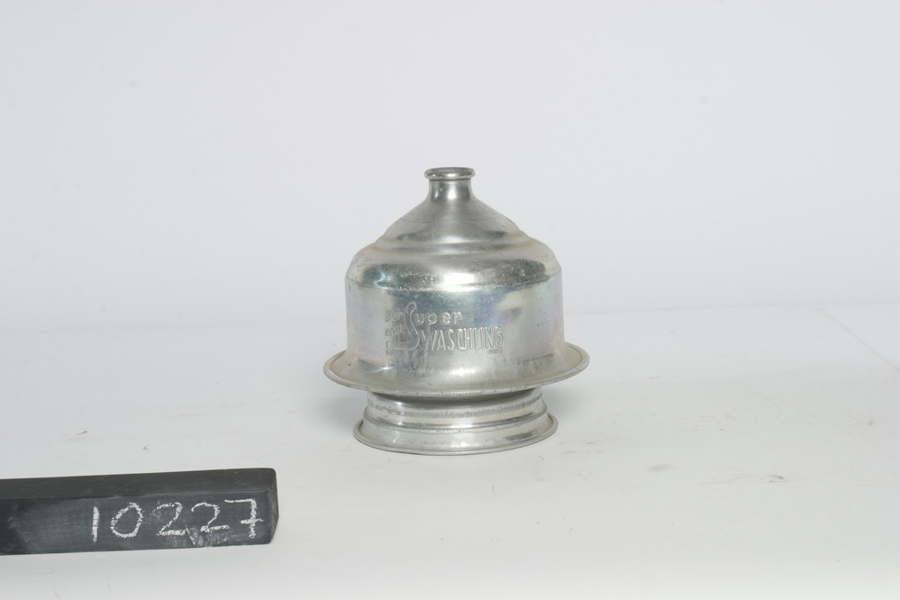 DWZ/DP handmatige wasstamper, een alluminium wasklok met verend binnenwerk met gaten. Op de stamper staat de inscriptie 'Der echte Super WASCHLING DP DWZ'. Stok is niet origineel.