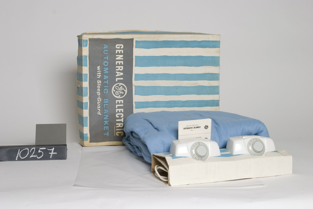 General elektric Automatic Blanket warmtedeken met elektrische verwarming, 220V 190W, met twee witte regelkasten met draaiknoppen met tien standen LO, 1 8. In een twee persoons licht blauwe wollen uitvoering. In de originele gestreept wit/lichtblauwe verpakking . Gebruiksaanwijzing aanwezig.