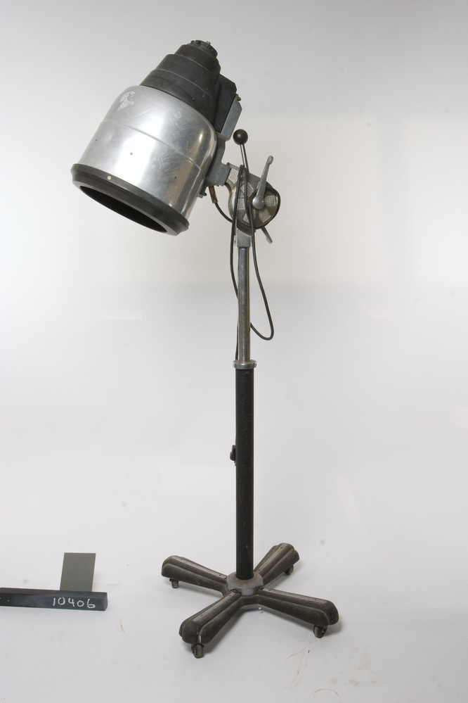Indola haardroogkap met elektrisch verwarmde föhn, 220V 610W max. Vermogen instelbaar: cold 80W, low 330W, med. 430W, hot 610W. Apparaatsnoer met contactstop met randaarde. In een zwart kunststof en blank metalen behuizing, bevestigd aan een op hoogte verstelbaar metalen statief met vier zwarte metalen vloerdelen met wieltjes. Fabr.serienr: 5129825. Merktekens: NV 733.