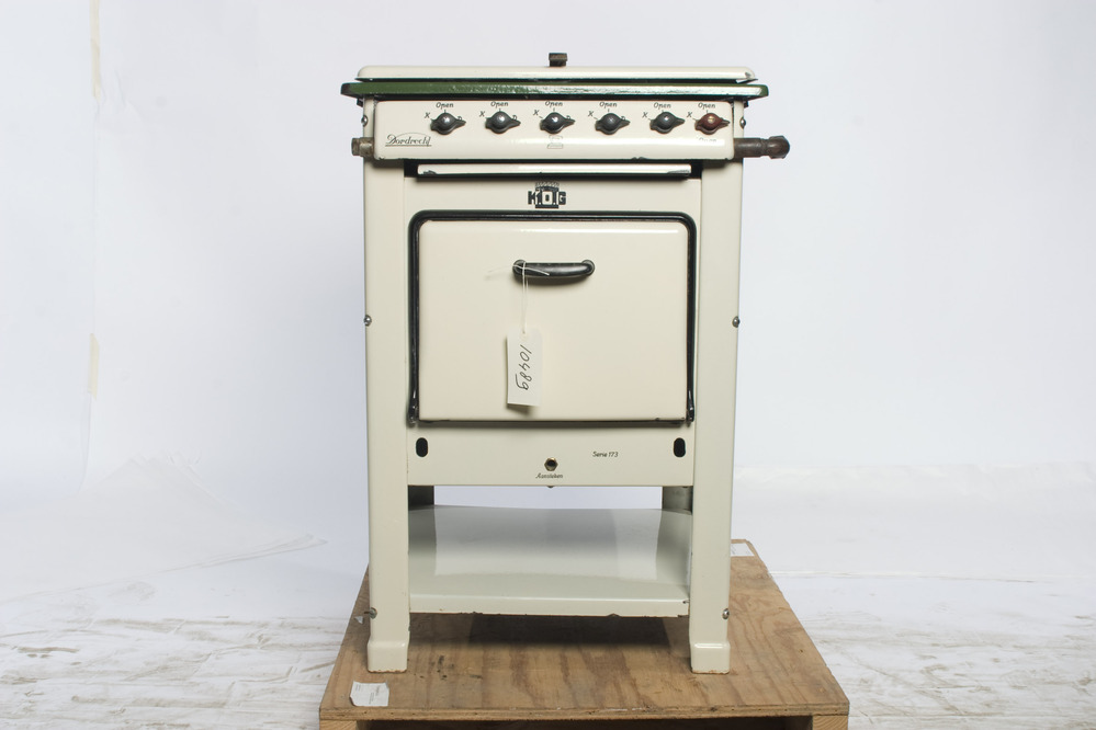 K.O.G. fornuis. Witte geëmailleerd gietijzeren kooktoestel, met vier gaspitten en een oven, rustend op vier poten. De ovendeur heeft een zwarte rand en hendel. Aan de bovenkant van het fornuis zit een groene rand waaronder vier zwarte draaiknoppen voor de gaspitten, een zwarte draaiknop in het midden voor een strijkbout, en geheel rechts een rode ...