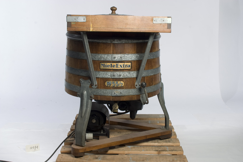 De houten Miele 55/2 uit 1935 is een stevig apparaat voor zware wasarbeid: een wasmachine met een eikenhouten kuip van 100 liter. Op de bodem draait een verticale wasbeweger met houten vinnen het wasgoed in het sop heen en weer. Hij wordt met een lederen drijfriem aangedreven door een elektrische driefasen motor (? Watt) geschakeld ...