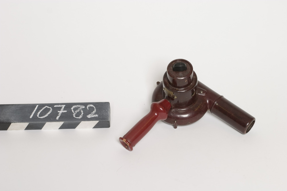 Sanitas Fön SON haardroger met een radiale ventilator en elektrische verwarming, 220V 550W. Draaischakelaar met standen 0 1 2. In een ronde zwarte bakelieten behuizing met bruin houten handvat.