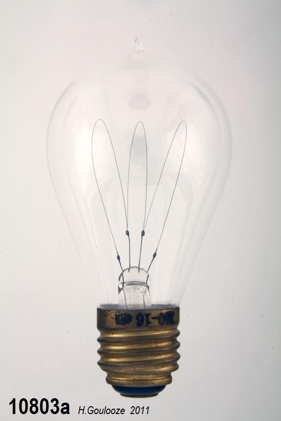 Beschrijving gloeilamp ref. 10803/ uitgave 2 / H.Goulooze Gloeilamp met een heldere glazen ballon. Aan de bovenzijde is de afgesmolten pompbuis zichtbaar. De huls, E27, is van messing en gemerkt 150-16 en gestileerd V.V. met een omschreven G. De isolator rond het centrale contact is zwart glas, Vitrite,. De stroom toevoerdraden zijn donker of zwart ...
