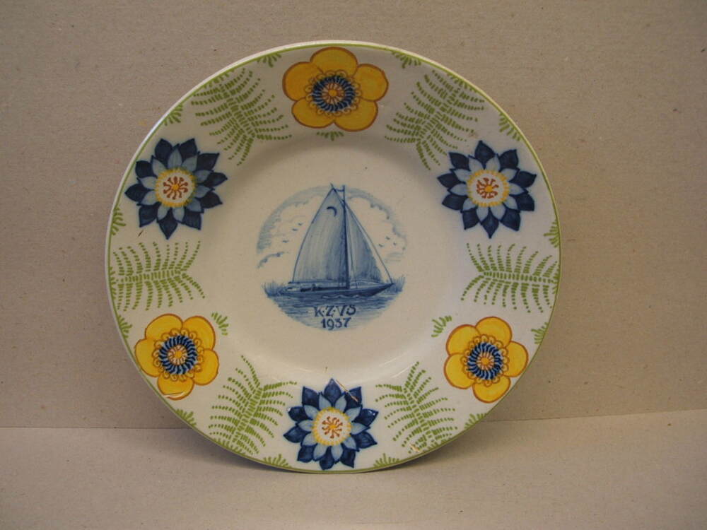 Bord, met veelkleurig decor, op de rand een driedelig floraal decor en centraal een afbeelding van een zeilboot (type regenboog) en het opschrift K.Z.V.S / 1937
