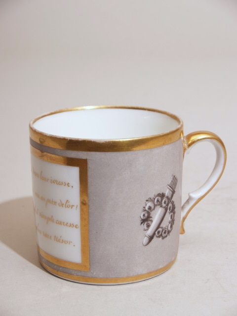 Kop (van kop- en schotel, maar zonder de bijpassende schotel) van porselein, centraal binnen een rechthoekig goud omrand kader versierd met een leifdesgedicht in gouden schrijfletters: Que les riches vantent dans leur ivresse, Ces vains plaisirs qu'ilsont au prix de l'or; De ma Sopie, le plus simple caresse Est à mes yeux un plus rare ...