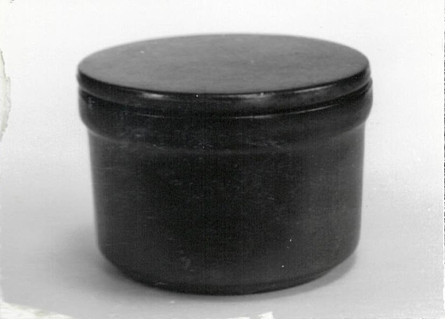 Cilindrische boterdoos met platte deksel zonder greep. Extern mat bruin glazuur, intern grijs glanzend. Onderdeel van 'Ovenvast servies in 2 kleuren, mispel en schors'