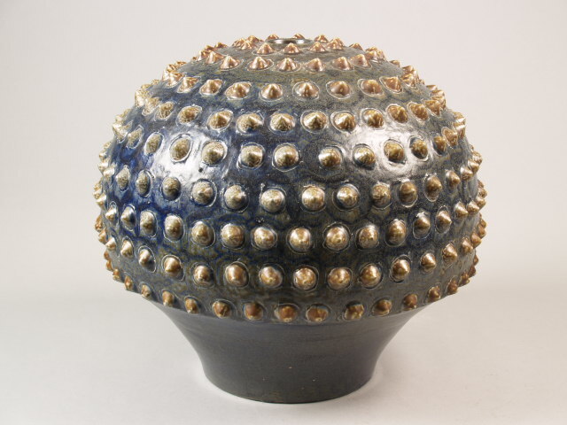 Bolle vaas op uitlopende voet met noppen patroon in reliëf. Associaties met het schild van een zeeëgel
