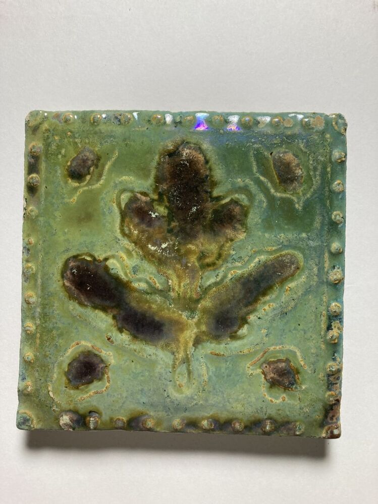 Tegel met een decor van een eikenblad en vier eikels in de hoeken
