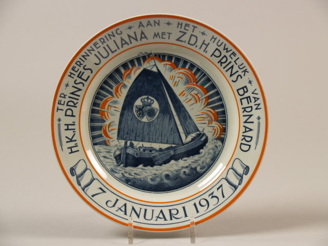 Herdenkingsbord met landschappelijk decor van zeilschip op zee, op zeil staan wapenschilden en kroon. Op rand tekst Ter Herinnering Aan Het Huwelijk Van H.K.H. Prinses Juliana met Z.D.H. Prins Bernhard 7 januari 1937