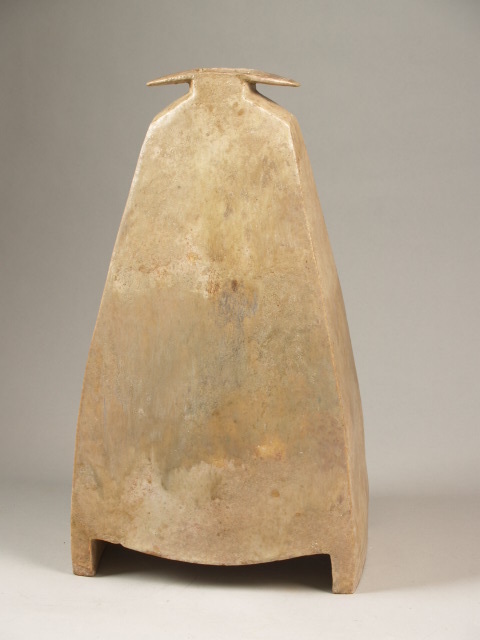 Hoge vaas op 2 pote met vrijwel rechthoekige basis, taps toelopend naar korte hals met uitlopende driehoekige flappen. Overdekt met beige-bruin glazuur