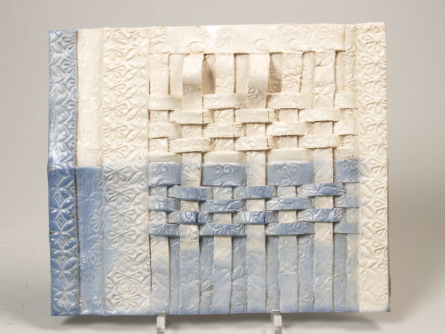 Rechthoekig reliëf opgebouwd uit vlechtwerk van stroken klei. De helft blauw geglazuurd. de andere helft wit geglazuurd. Striken (?) voorzien van gestempeld decor van bloemen