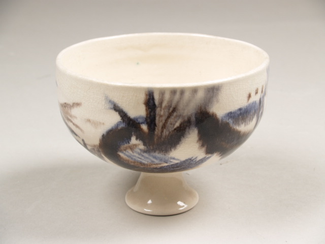 Kom op hoge voet overdekt met een wit craqueléglazuur en lineair decor in donkerblauw en blauw onderglazuur