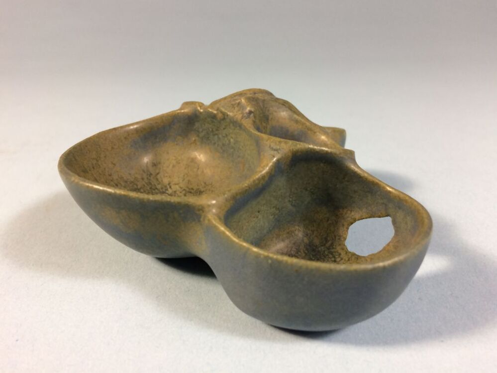 Beeld bestaande uit vijf samengevoegde organische schelpvormen. Buitenzijde kobaltblauw glazuur, binnenzijde groen schiftend glazuur.