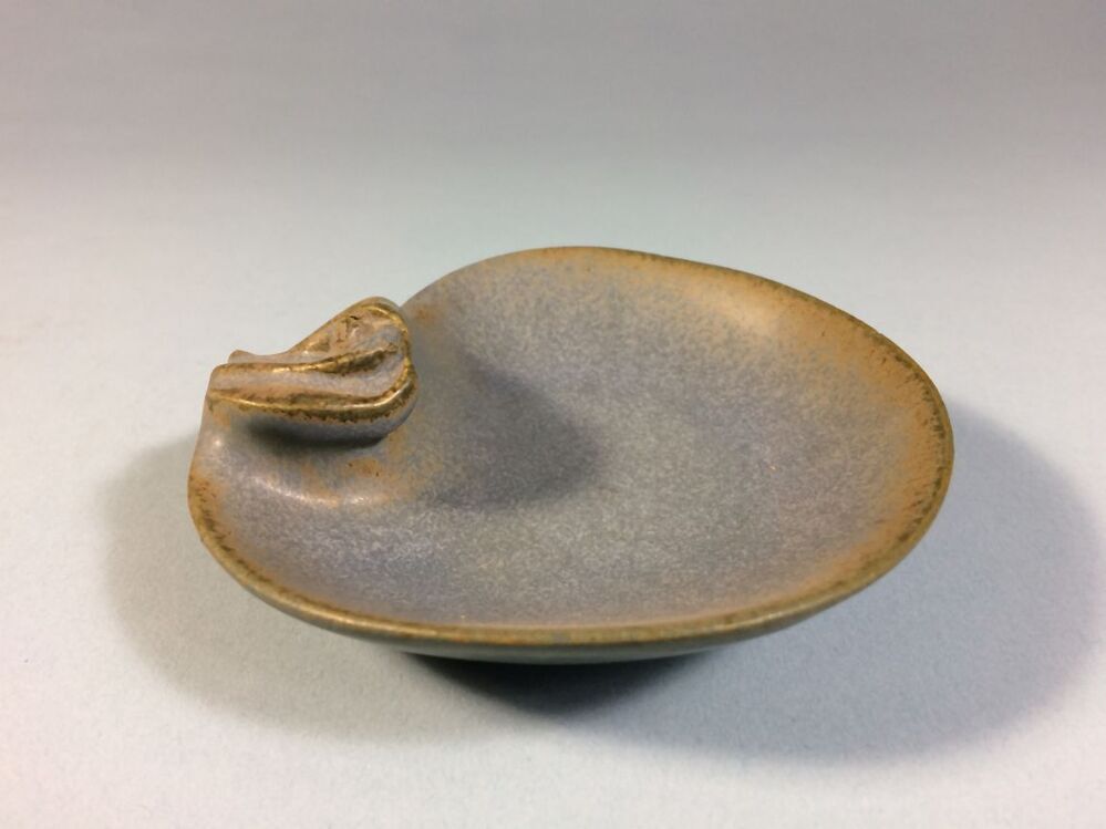 Beeld bestaande uit twee samengevoegde organische schelpvormen. Een grote en een kleine. Geheel overdekt met kobaltblauw glazuur en groen gele sinter engobe.