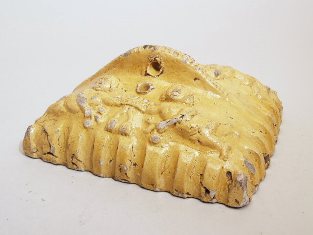 Vuurstolp, geel, met reliëfdecor van putti die kroon vasthouden