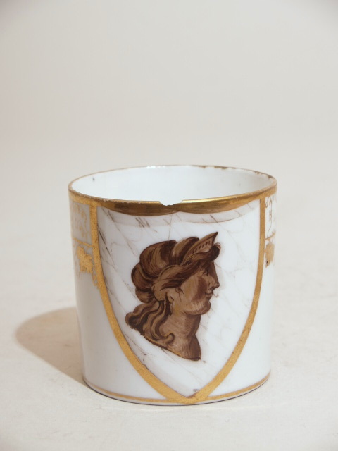 Kop (van kop en schotel, maar zonder schotel) van porselein, in goud en bruin gedcoreerd met een schild met de letter 'E' en een romeins vrouwenhoofd en randen afgezet met gouden biezen.