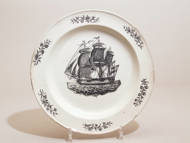 Bord van creamware, door middel van een transferprinttechniek in zwart gedecoreerd met centraal een fregat op zee en op de rand met 6 bloemtakken. De bloemtakken zijn spiegelafdruk van een ontwerp dat Guy Green maakte voor Wedgwood (circa 1775).