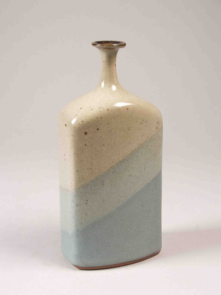Vierhoekige, flesvormige vaas met smalle, hoge trompettuit. Decoratie van geel-grijze, blauwe en bruine glazuren in diagonale zones