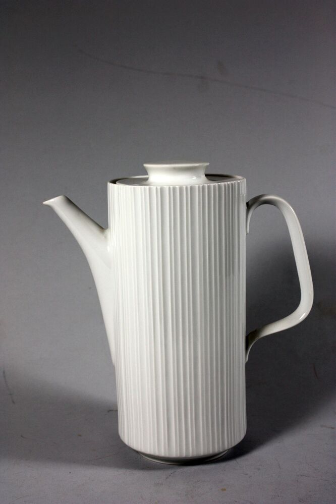 Hoge, cilindrische koffiepot met deksel met platte knop, decor van verticale lijnen in reliëf aan buitenwand, wit en transparant geglazuurd, decor Black-White, model Variation.